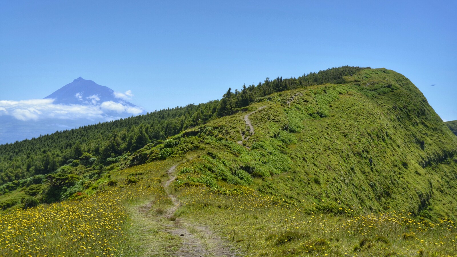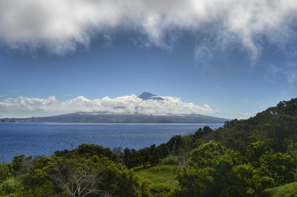 No es una subida complicada en absoluto, pero tiene una pendiente bastante maja comparada con el resto de la ruta. Dese aquí las vistas de la Ilha de Pico son formidables. Se puede apreciar en su totalidad, dominada por su prominente Pico (2351 metros). ¡Tan cerca (a unos 6 km de Faial) pero a la vez tan lejos!