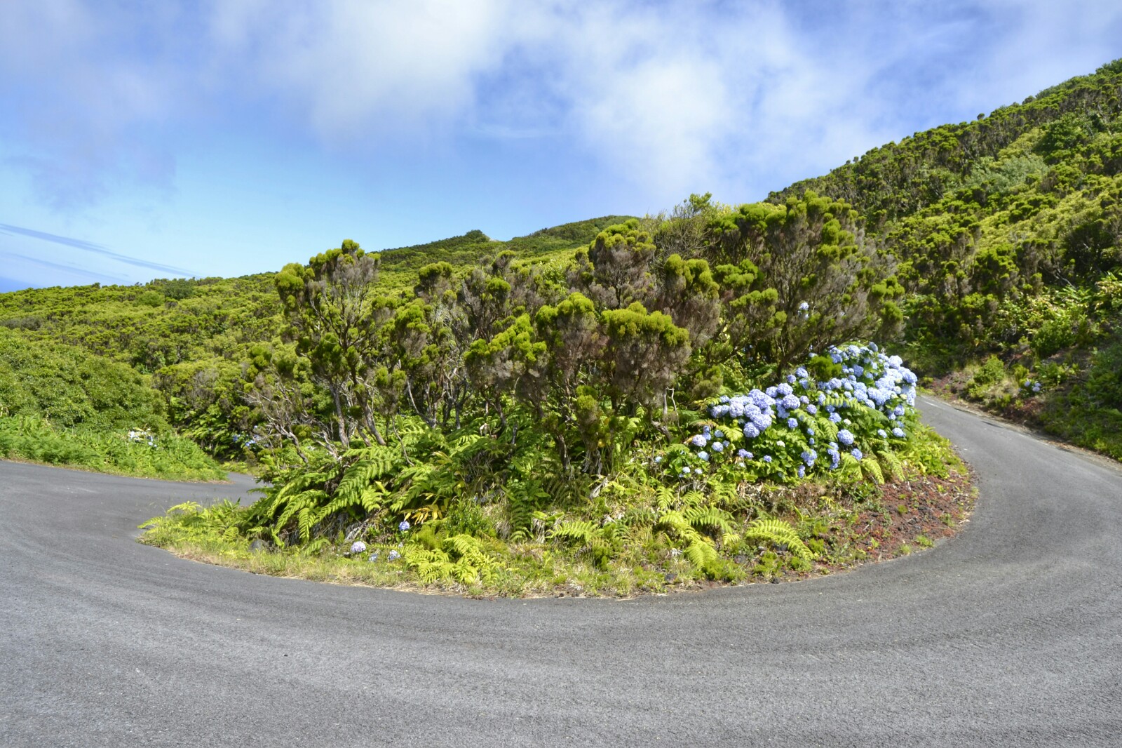 ¡Y cómo se notaba el cambio de altitud! A 200 metros las vistas de la costa eran muy buenas, pero ya por encima de los 400 metros toda una nueva dimensión se perfila en el horizonte, destacando la primera vez que se pueden distinguir tanto Cabeço do Canto como Capelinhos (como siempre, flanqueados por una barrera de hortensias y todo tipo de verde).