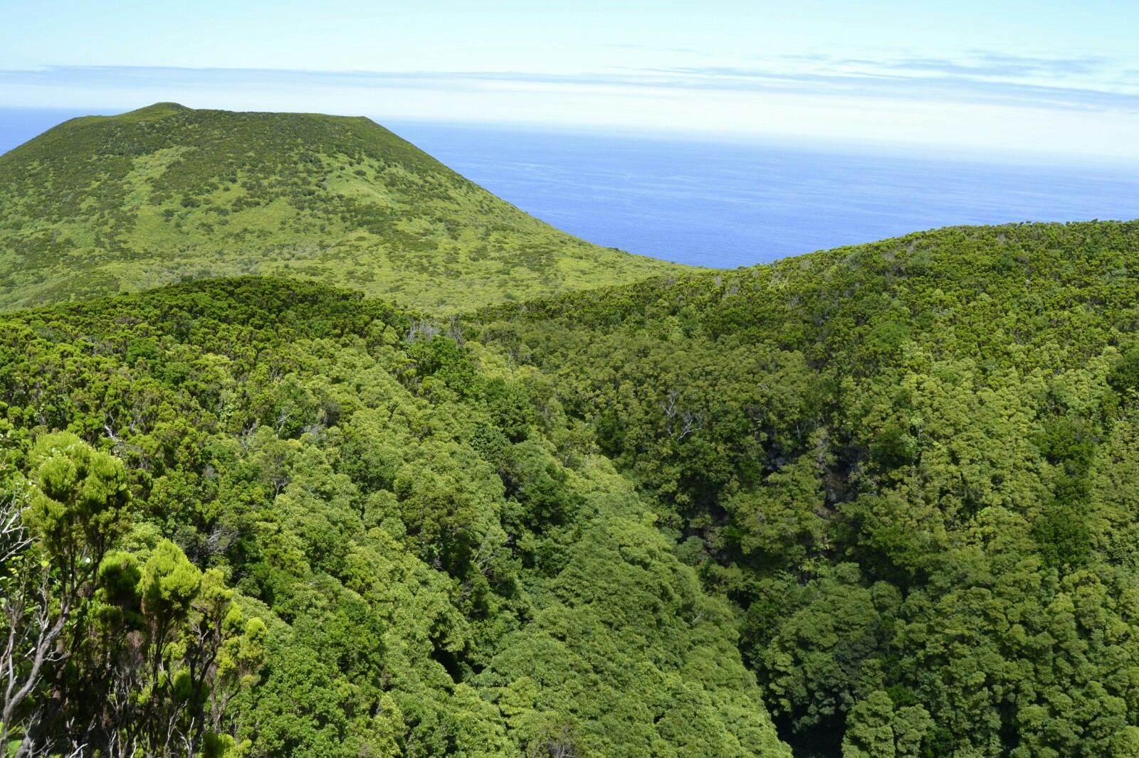 Hacia abajo (hacia la costa), vemos ya la punta norte de Faial, Ponta dos Cedros, separada de nuestra posición por un extenso y frondoso bosque.
