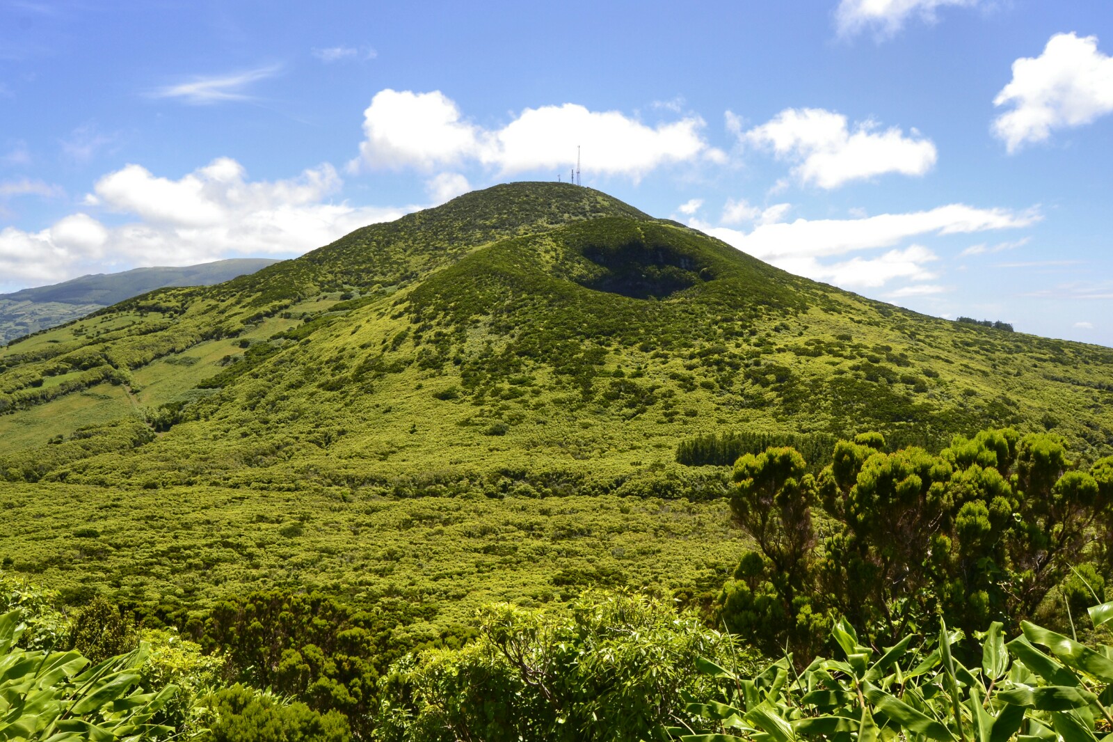 Aquí, antes de llegar a lo alto, es vital darse la vuelta. A mi juicio. Una de las mejores vistas de toda la ruta. Se aprecia perfectamente el volcán de Cabeço Verde y el sub-volcán de Caldeirao, elevándose ligeramente y sobresaliendo de su ladera. ¡Precioso!