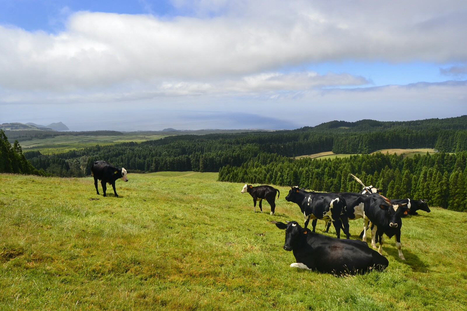 Y así, sin darnos cuenta, llegamos a un cambio absoluto de escena. Salimos del bosque para acabar en un precioso prado con unas vistas espectaculares. Detrás tenemos la colina por la que hemos venido, repleta de árboles y, delante de nosotros, un rebaño de vacas pastando tranquilamente con vistas de Angra y del Océano.