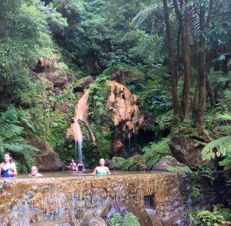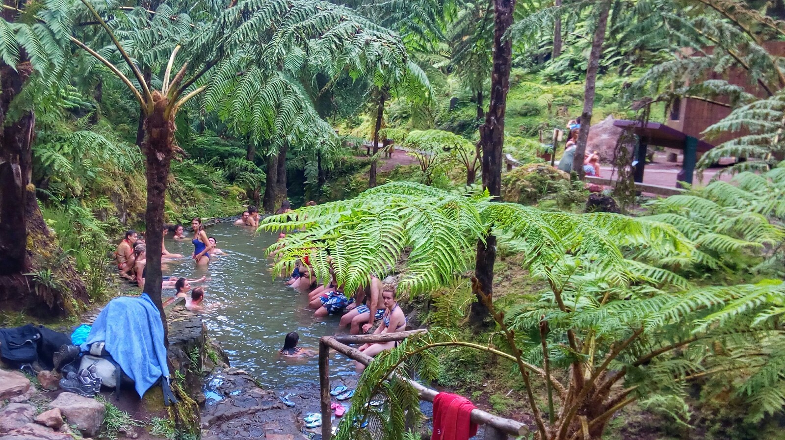Siguiendo la carretera que nos trajo hasta la Lagoa do Fogo (pero ahora ya en descenso) se llega a estos baños naturales enclavados, literalmente, en la jungla de São Miguel.