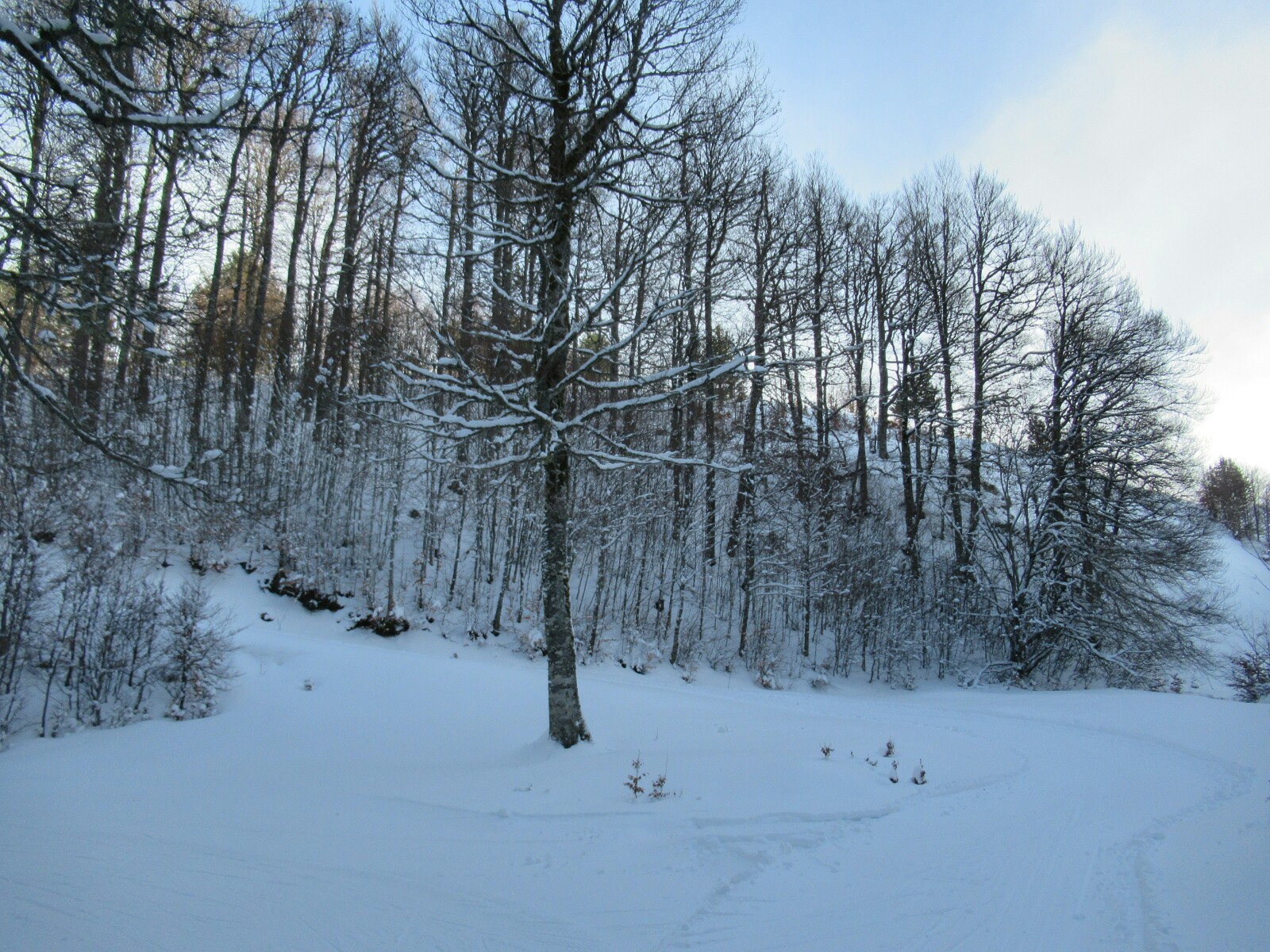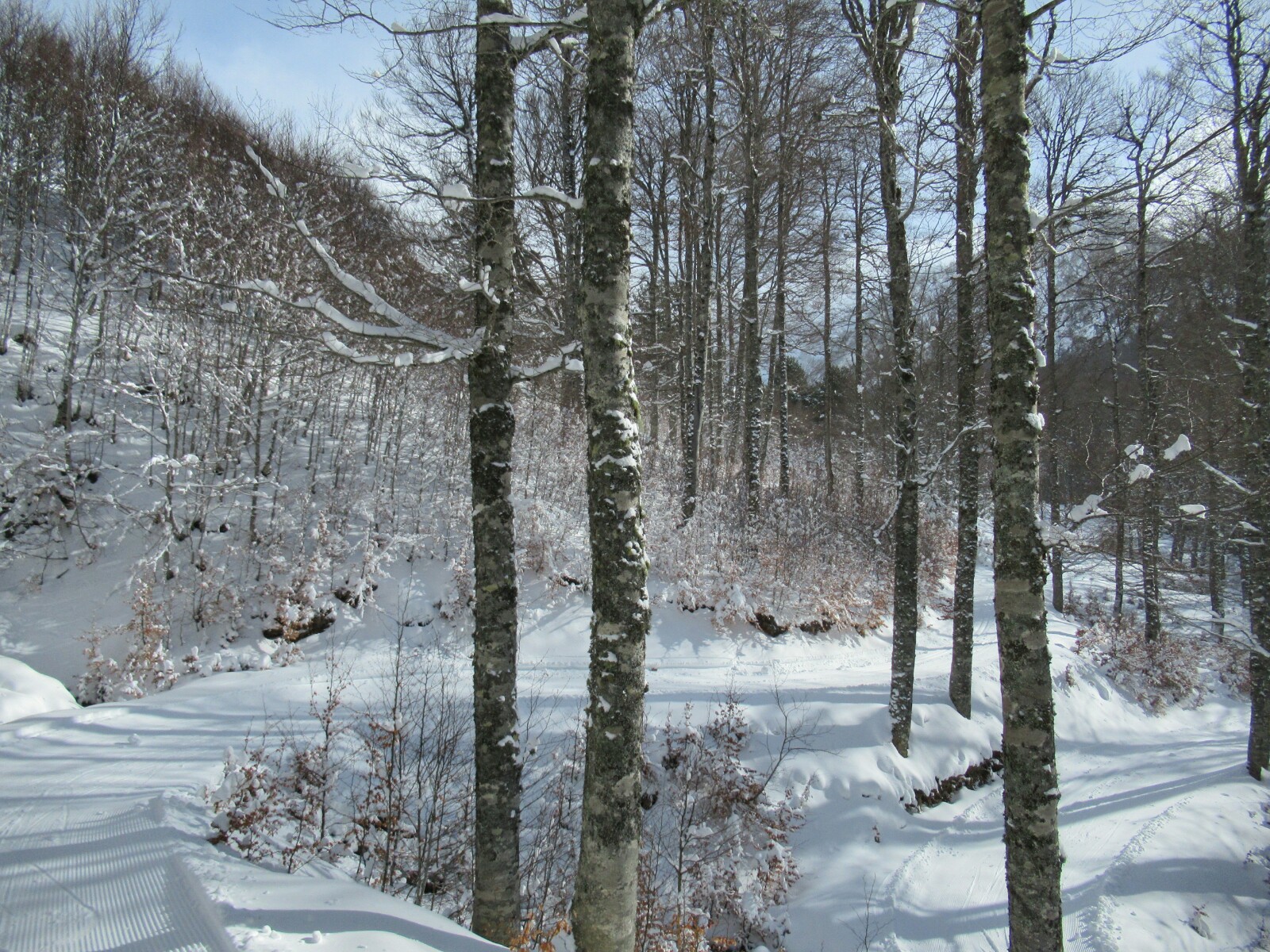 Las pistas son relativamente llanas, con un aire que me recuerda a Laponia incluso más de lo que me recordaban las de Abodi. En el fondo, las tres que hay (la pista verde, la azul y la negra) forman casi un único circuito caracterizado por un enorme llano abierto (en la parte más baja), un precioso bosque más o menos llano (la pista azul), y un par de subidas algo prolongadas que terminan en la parte más alta del circuito que es también moderadamente llana (la pista negra).