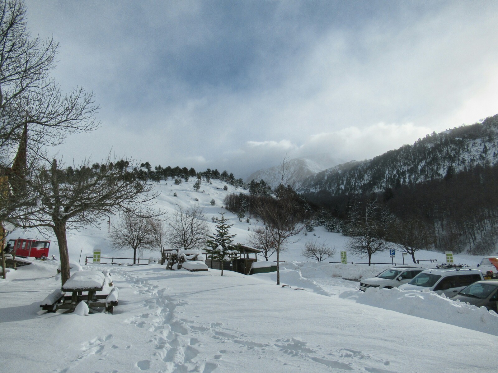 Tuvieron que salir del coche a palear la nieve acumulada durante un buen rato hasta que pudieron dar marcha atrás. En ese tiempo aparecieron varios coches que se quedaron detrás del mío haciendo cola. Finalmente, llegó la quitanieves (aragonesa, supongo) y despejó el camino hasta el refugio, limpiando también la explanada del parking para que pudiésemos aparcar.