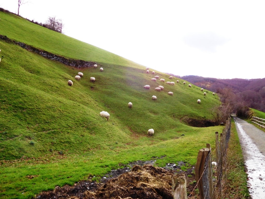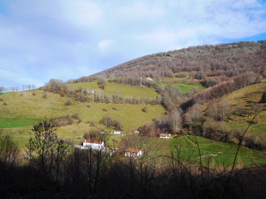 Para volver, deshacemos unos cientos de metros el mismo camino y después tomamos el desvío mencionado antes que ahora queda a mano izquierda en suave ascenso. Llegaremos al punto más alto de la ruta (650 m de altitud) donde nos encontraremos con un poste con indicaciones. Debemos seguir a mano derecha hacia Iribas, caminando por una pista ancha, distinguiendo a lo lejos las casas de Lekunberri