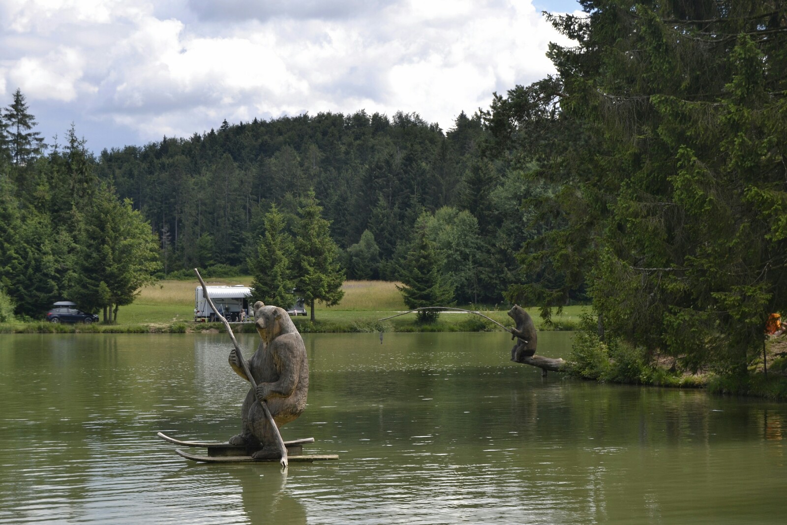 Es cierto que es bonito, pero no da para hacer ninguna caminata (el lago es tan pequeño que se rodea en 10 minutos). Lo que le da un toque diferente son las esculturas de madera de osos haciendo diferentes actividades deportivas.