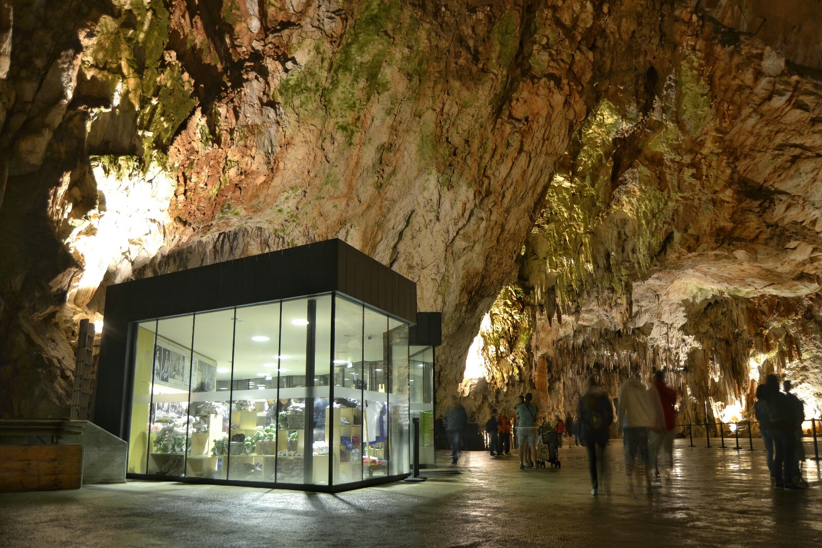 A continuación, se llega a la Koncertna Dvorana (Sala de Conciertos), que es la estancia más grande de la cueva y que puede albergar a 10.000 personas. No sé si en algún momento podrá confluir tanta gente, pero lo que sí que han instalado aquí es… ¡La tienda de recuerdos! Aquí… ¡Dentro de la cueva! Alucinante, para desterrar a quién tuvo la idea.