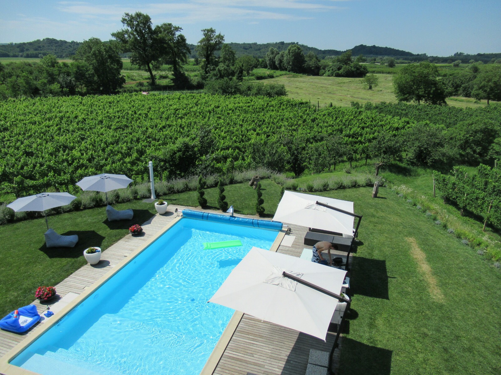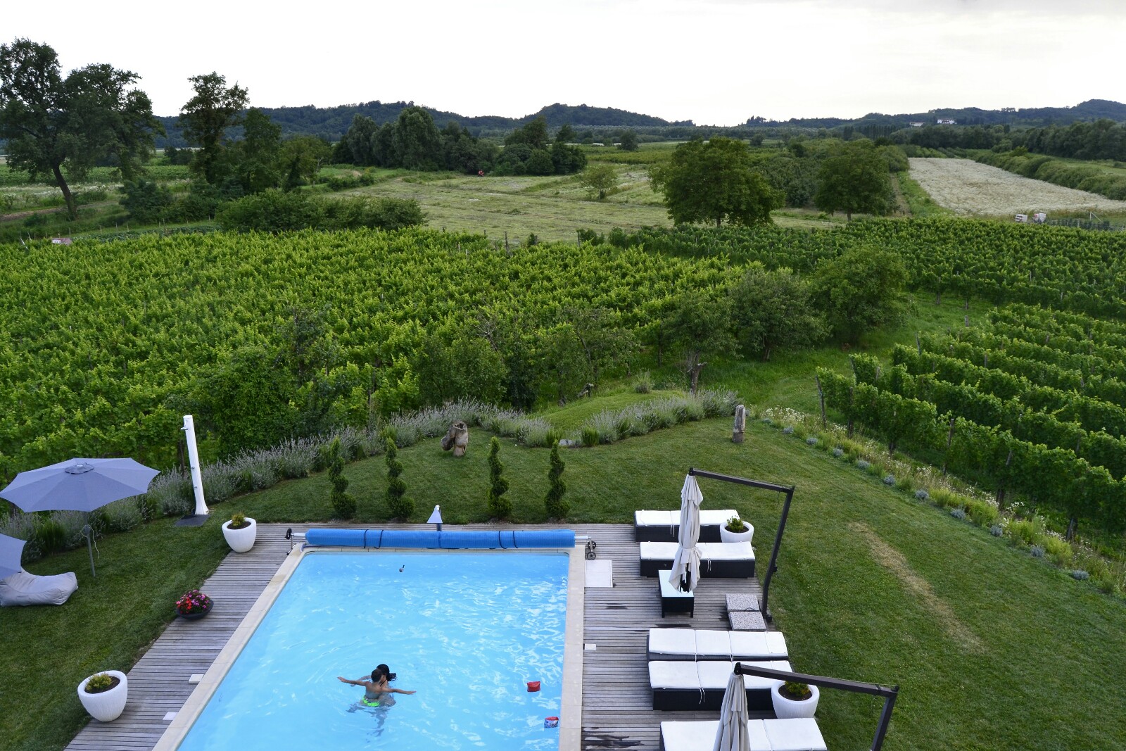 Aprovechamos para hacer el check-in y maravillarnos con nuestra enorme habitación, con dos grandes estancias y vistas a la piscina y a varios viñedos.