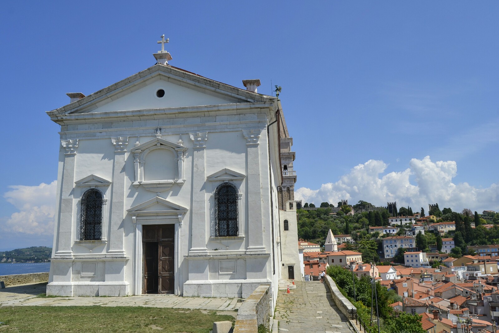 Bordeando la Punta Madona, llegamos a la cara norte de la península, con vistas a la costa italiana, y donde podemos visitar uno de los edificios más interswantes de Piran tanto por su ubicación como por su historia: La Cerkev Sv Jurija (Iglesia de San Jorge).