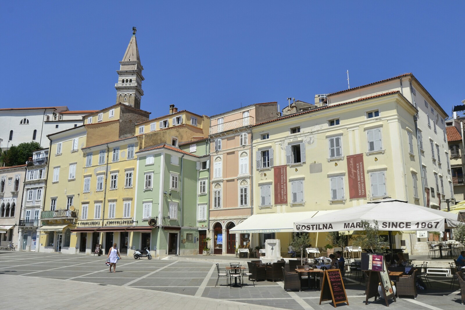La plaza recibe su nombre del aclamado violinista del siglo XVIII Giuseppe Tartini y está adornada por un sinfín de maravillosos edificios entre los que destacan la propia casa de Tartini, el Ayuntamiento, la Iglesia de San Pedro y la coqueta Benecanke Hisa (Casa Veneciana) del siglo XV.