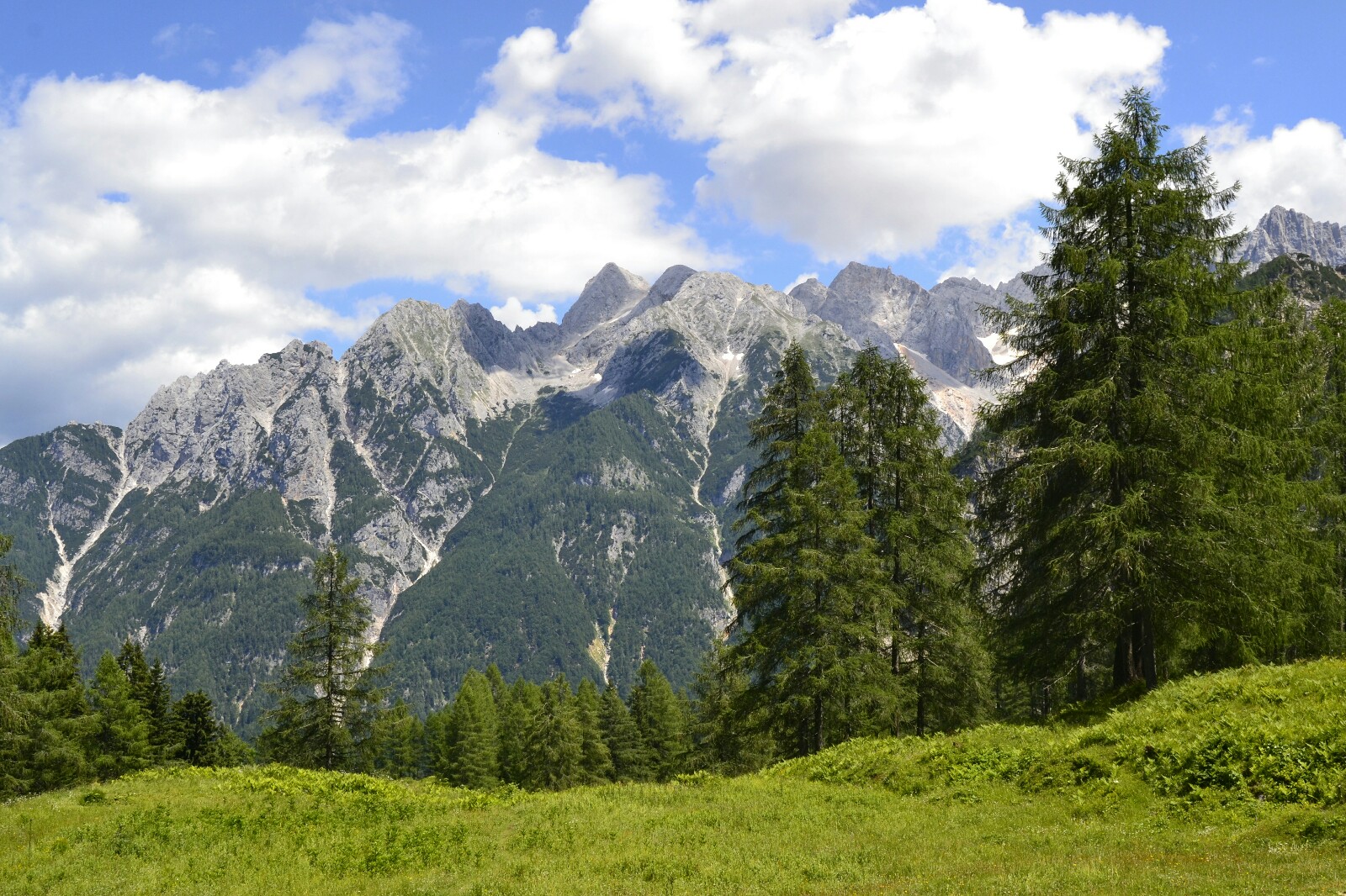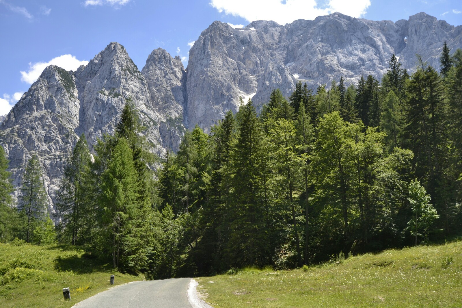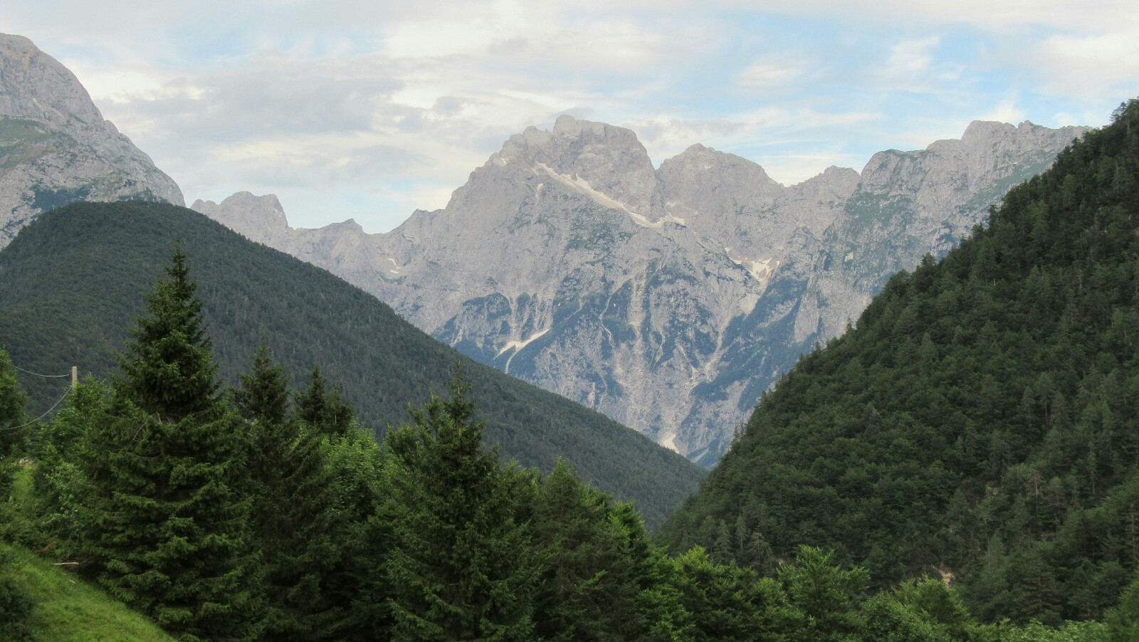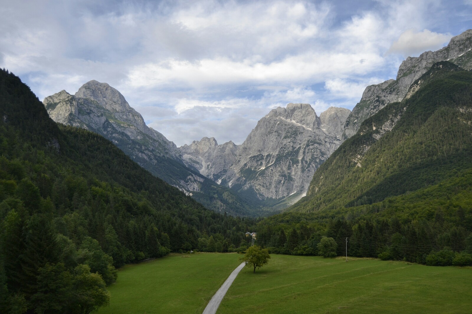 Pronto pasamos por este pequeño poblado ya alejado del bullicio habitual de toda la gente que visita el valle. El pueblo en sí no parece tener nada de especial, pero las vistas de las montañas son realmente insuperables. El contraste del verde de la hierba y el bosque con las paredes rocosas de los Alpes Julianos es sobrecogedor.