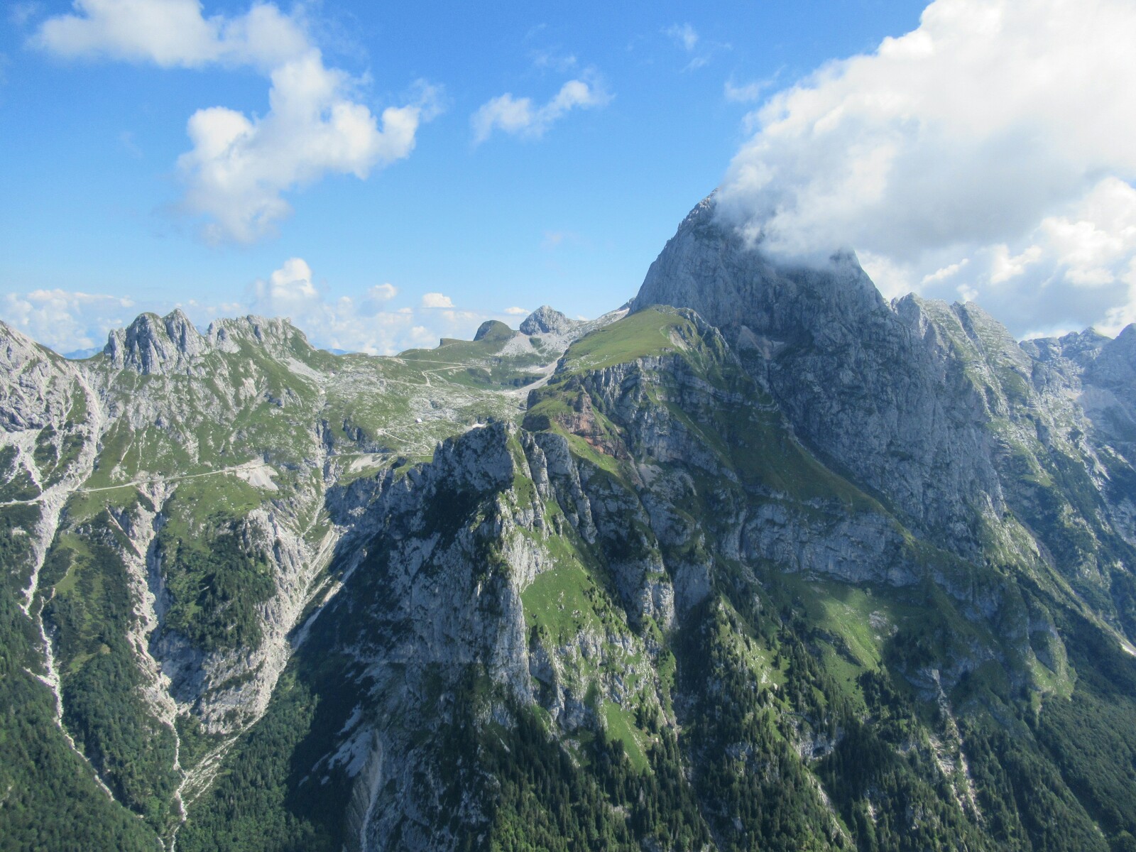 Primero comenzamos planeando sobre el área del Mangart, atravesando alguna que otra nube y llegando casi hasta la altura de su cima (por encima de los 2600 metros).