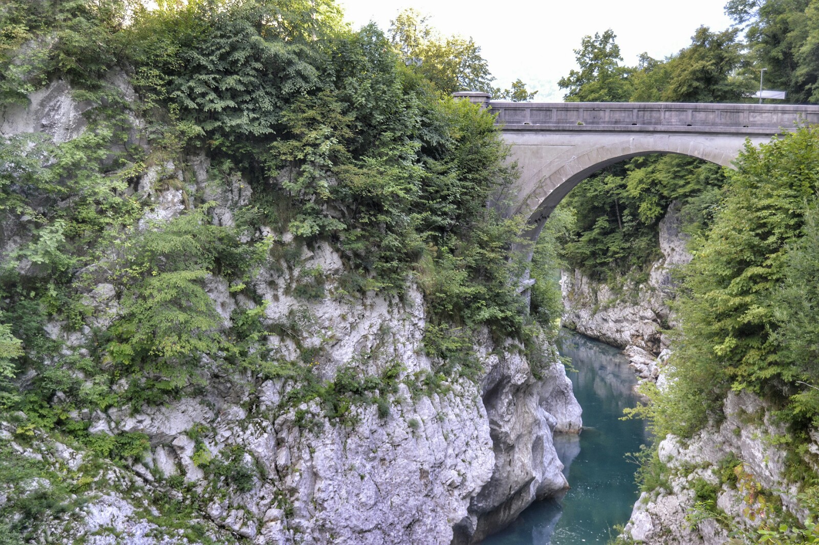 La primera parada que hicimos fue en Kobarid, pueblo situado ya dentro del valle, a unos 10 kilómetros de Tolmin. Muy cerca del centro, la carretera sigue hasta llegar al Napoleonov Most, un puente de piedra muy elegante que conecta los dos lados del río con unas vistas espectaculares de la garganta.