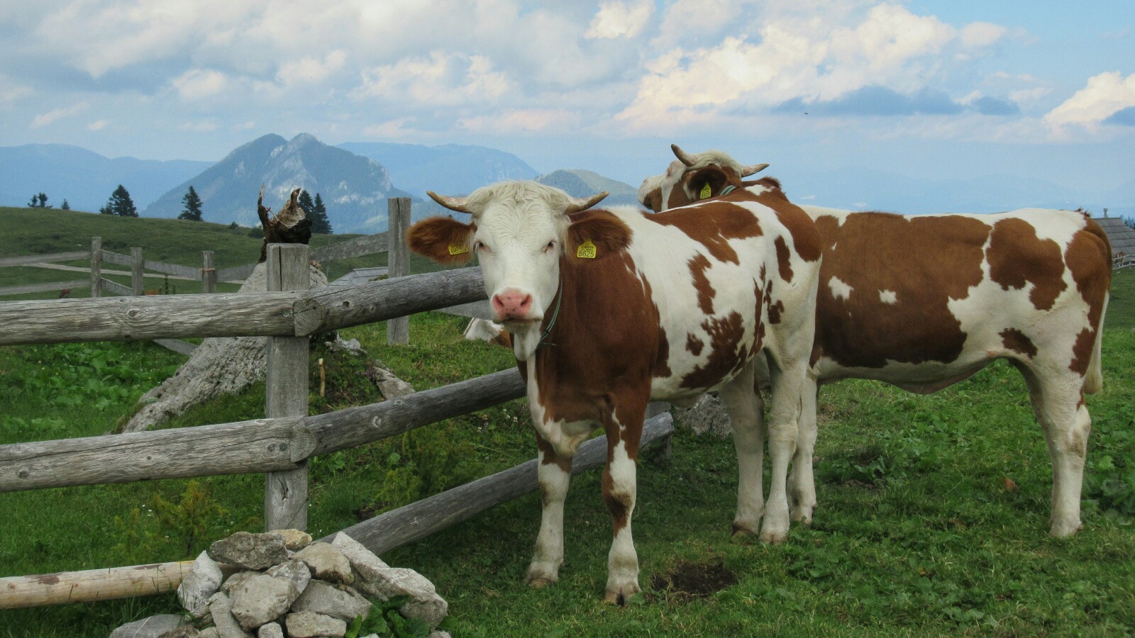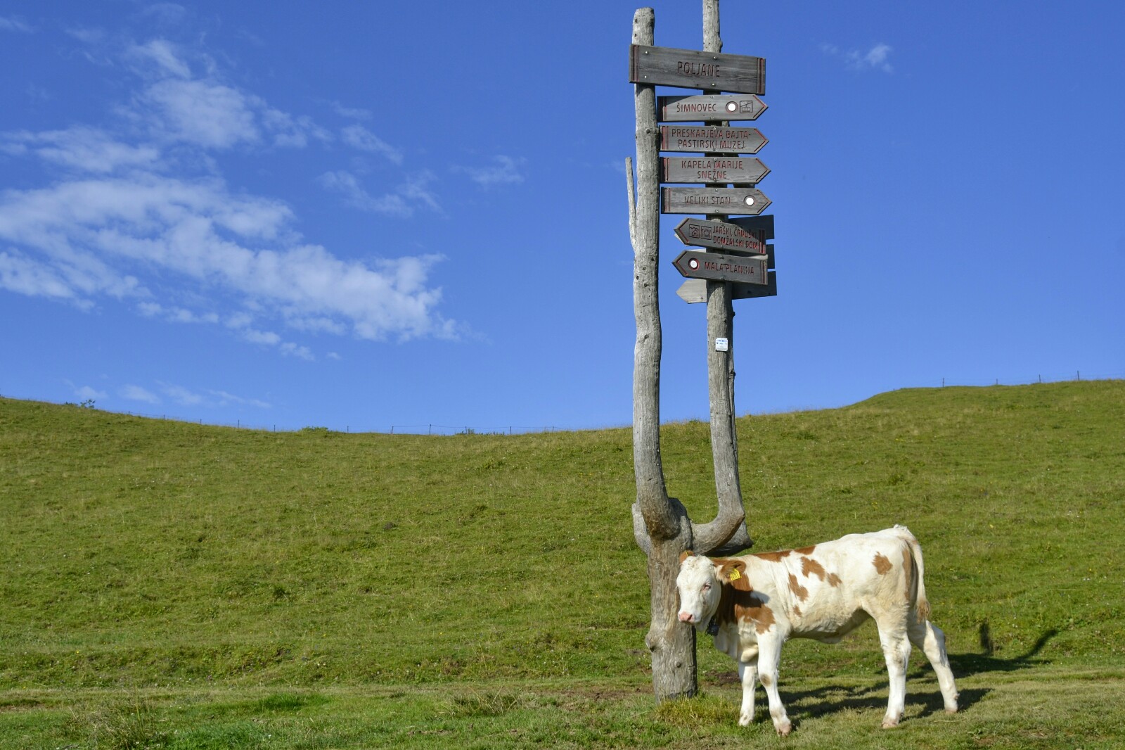 Las vacas fueron las primeras en darme la bienvenida a Mala Planina, la zona a la que llega la ruta. Dejando ya atrás el bosque y los precipicios, se accede directamente a lo alto de esta planicie tras una pequeña subida final ya por verdes prados que nos deja en la primera zona de cabañas.