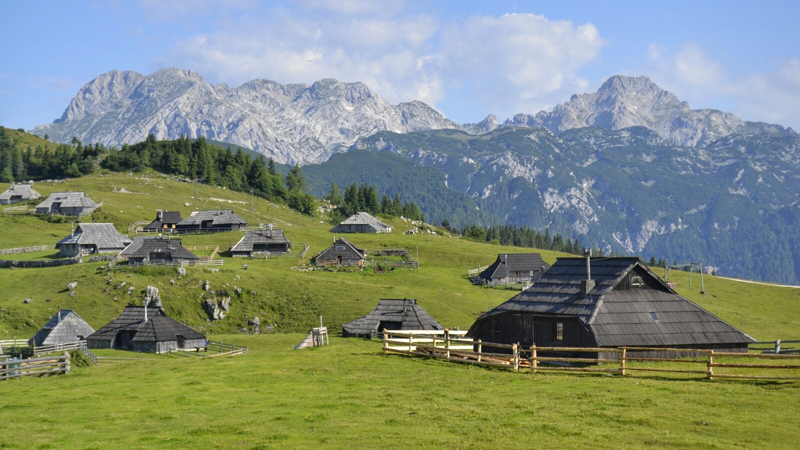 Se mire hacia donde se mire, hay decenas de estas cabañas con el magnífico fondo de la pradera y los árboles o de los majestuosos Alpes de Savinja.