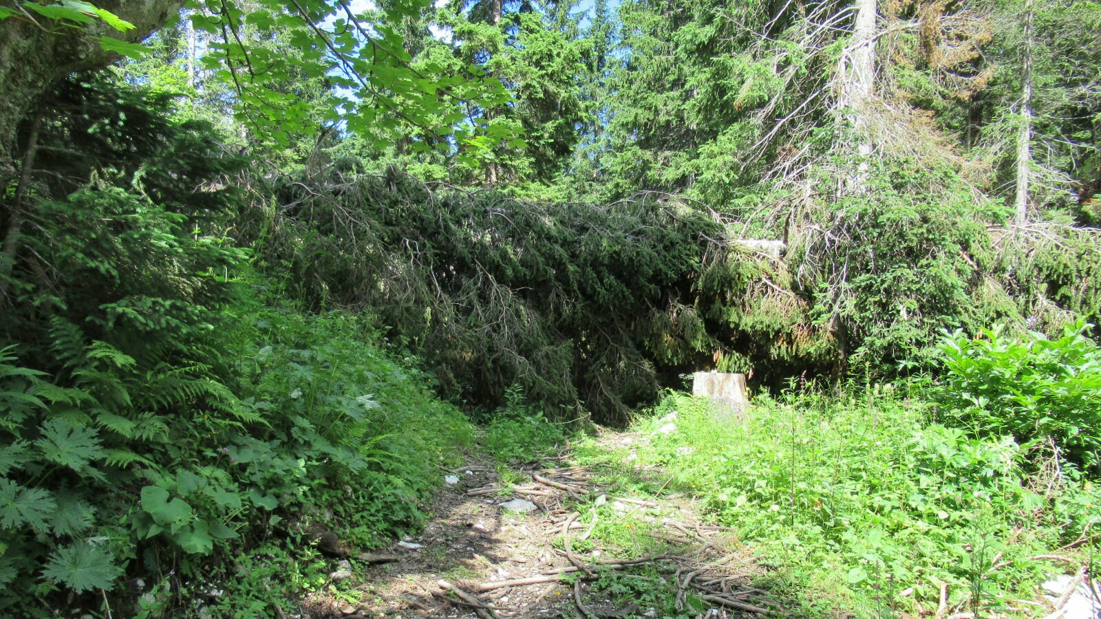 Siguiendo el camino me encontré con un problema. La ruta que me había marcado Lojz estaba cortada, así que tuve que tomar un desvío monte arriba atravesando un bosque con decenas de árboles caídos que, curiosamente, cortaban siempre el paso.