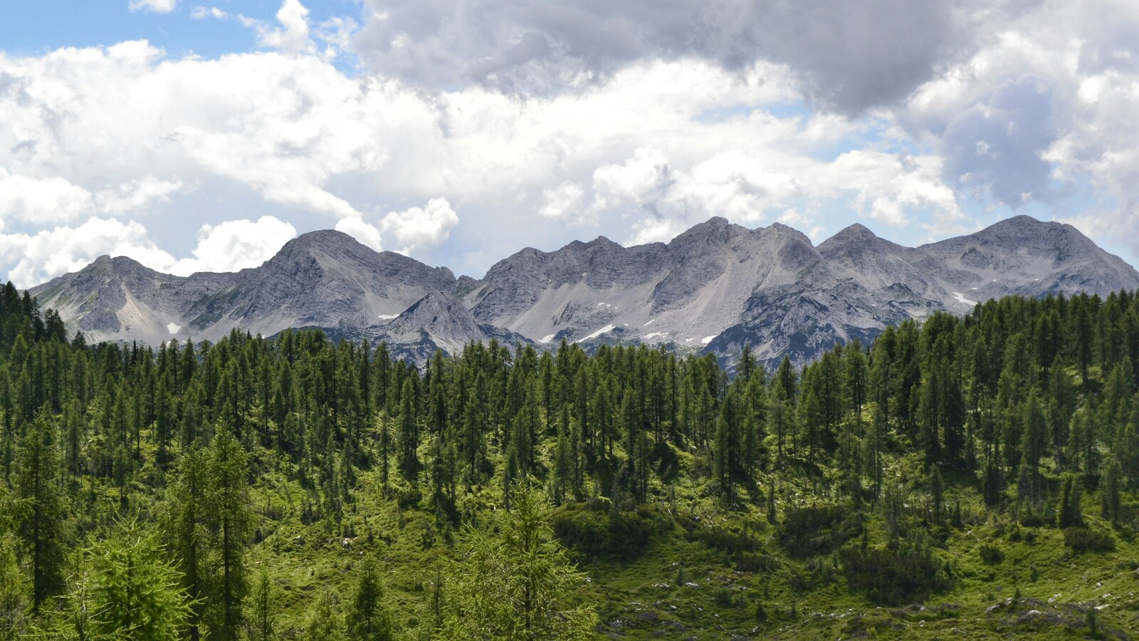Siguiendo el camino señalizado, nos adentramos en una zona bastante abierta poblada por árboles, arbustos y con un imponente muro de piedra al fondo formado por varios picos de los Alpes Julianos.