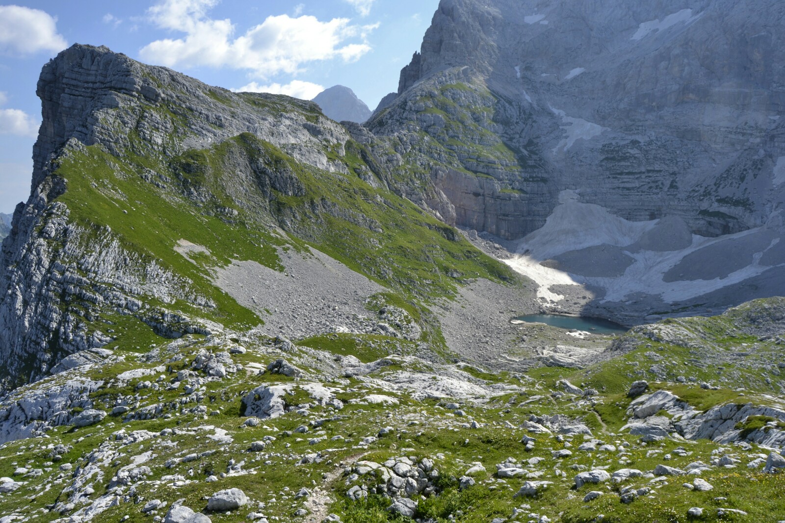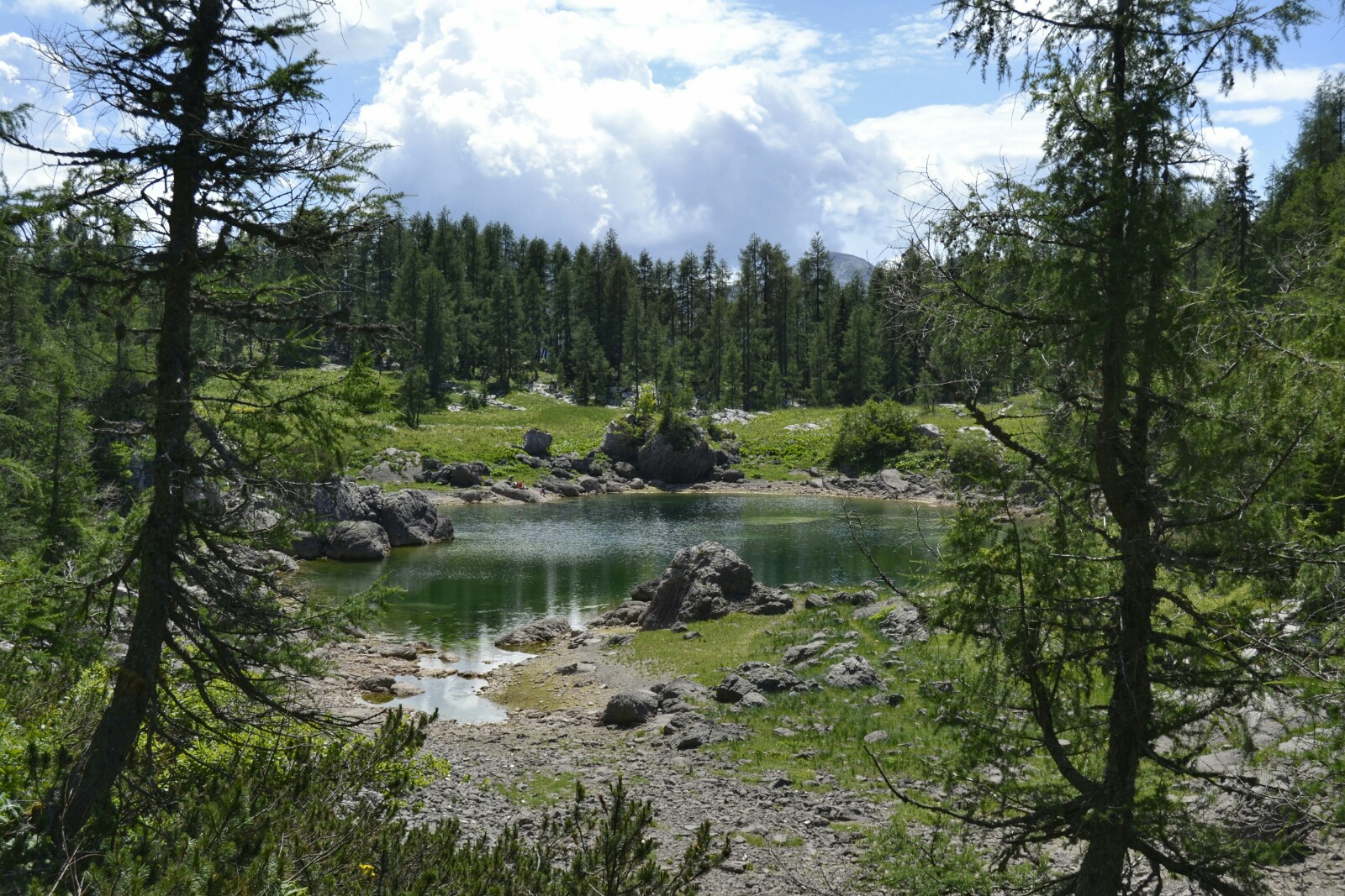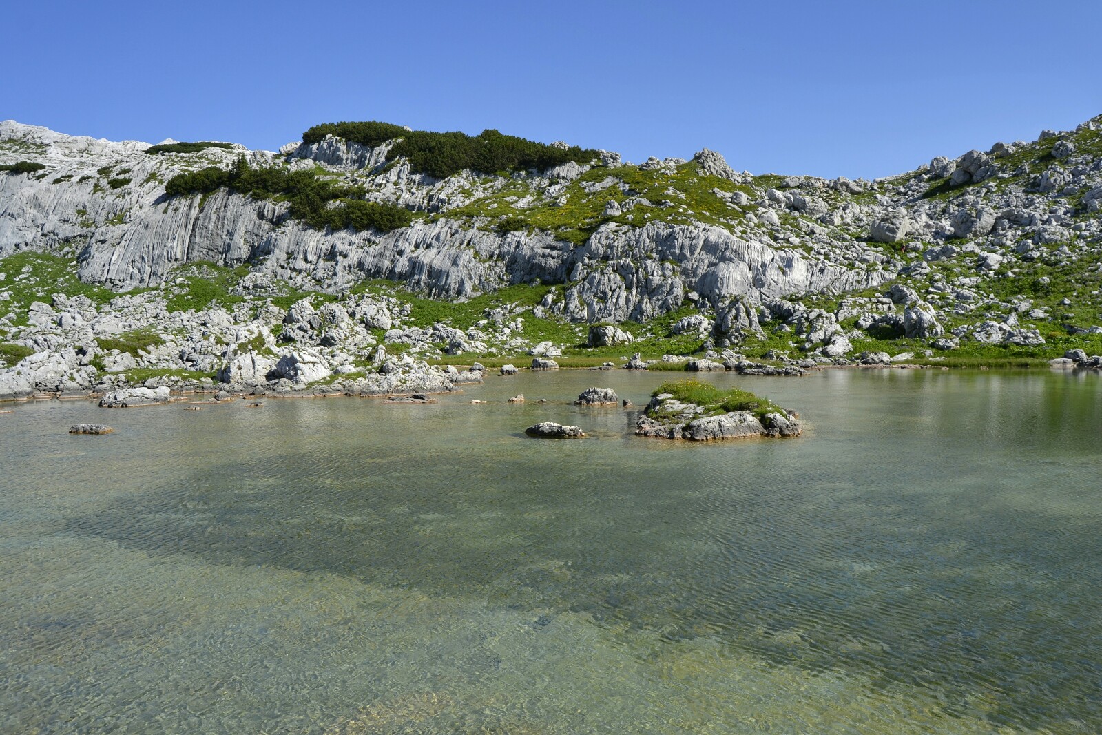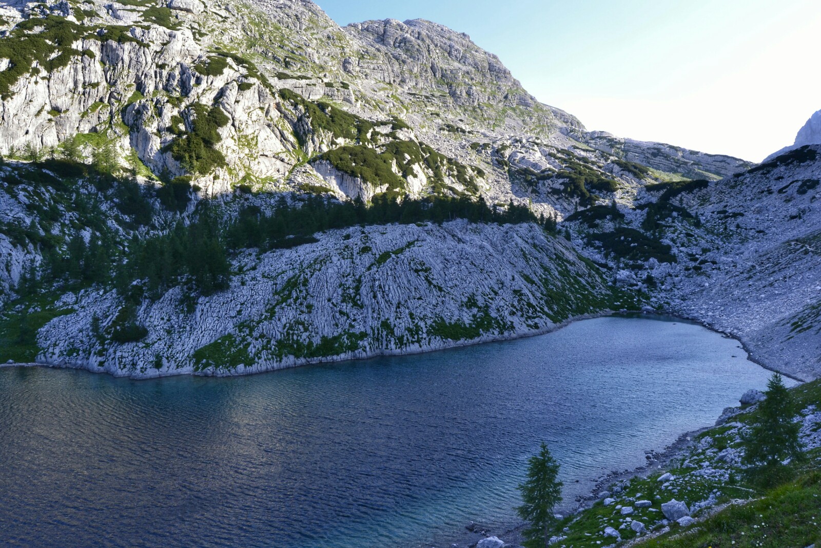 El primero que nos encontramos es el pequeño Jezero Pod Vrsacem, un lago muy pequeñito medio escondido bajo una de las innumerables paredes verticales de la zona.