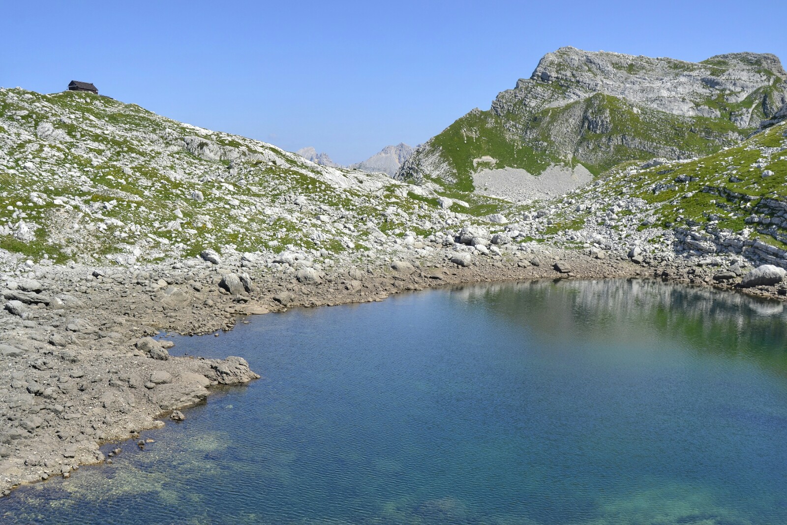 Justo después viene el Rjavo Jezero, desde el que hay una buena vista del refugio que acabamos de dejar atrás y de algunos de los picos que se veían desde lo alto del collado.