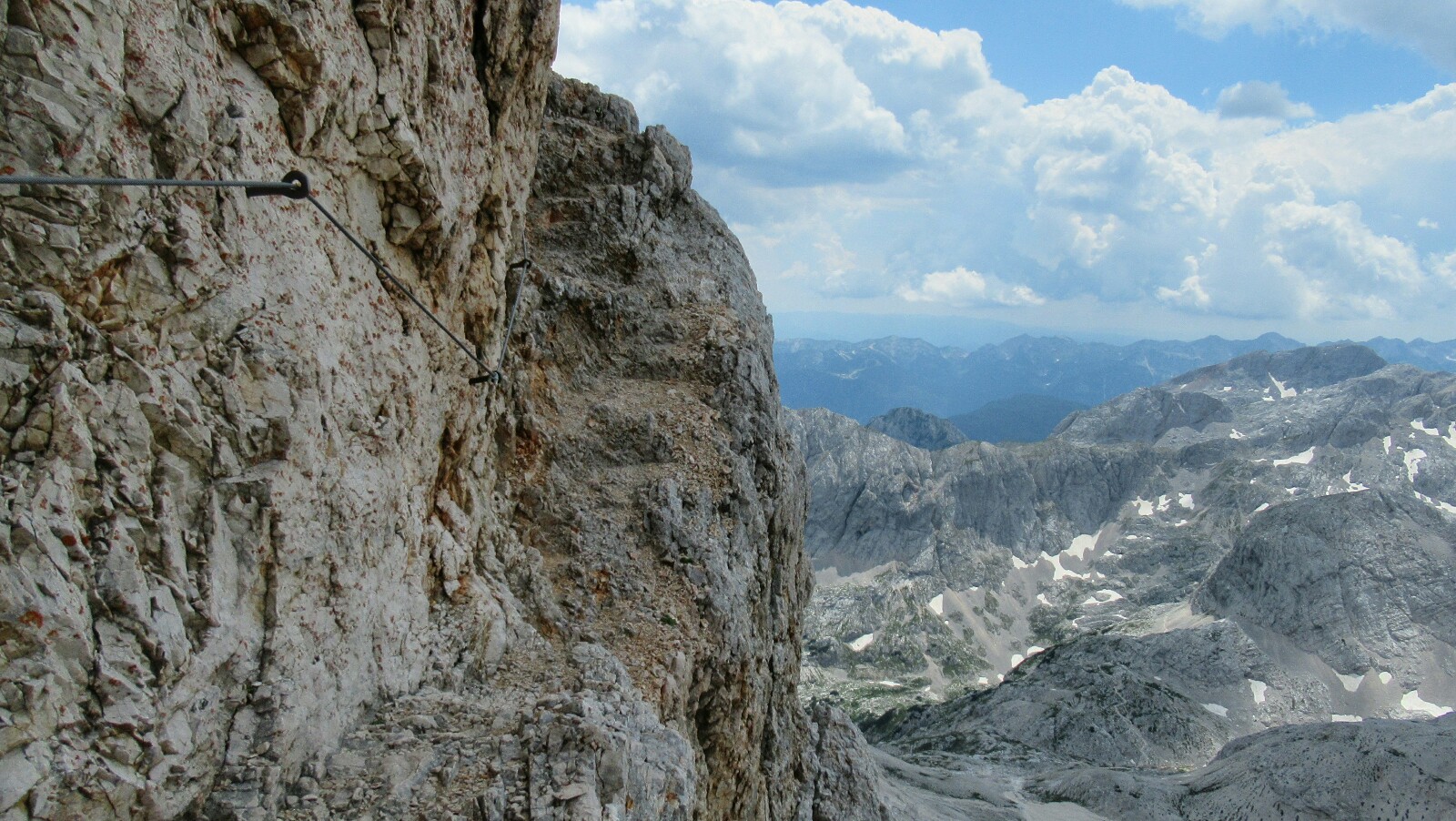 Al acabar del zigzag y pasar de los 2300 metros de altitud aparecieron las primeras nieves del trekking. Desde este punto hasta lo alto del Kanjavec (2568 metros) tuve que cruzar varios neveros que aumentaban el grado de dificultad de la ruta, ya que se resbalaba bastante (no voy a negar que me di un par de culadas).