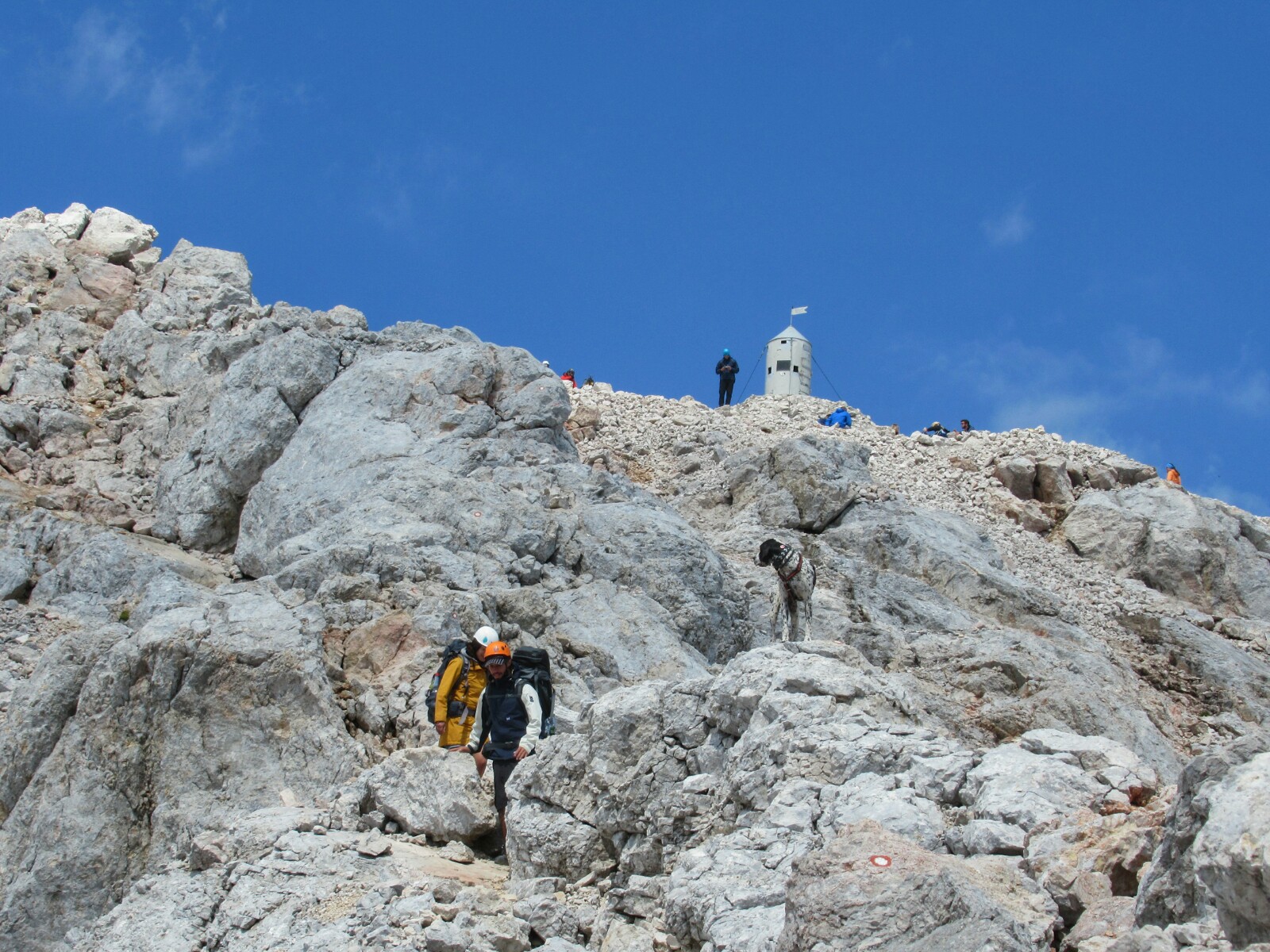Una vez más, no es complicado, pero hay que ir con agarre firme y tanteando bien el terreno (o el pivote) antes de apoyar los pies de forma alocada. Siguiendo el trazado pronto veremos la caseta (o el «Sputnik» como le llamé yo) que marca la cima del Triglav.