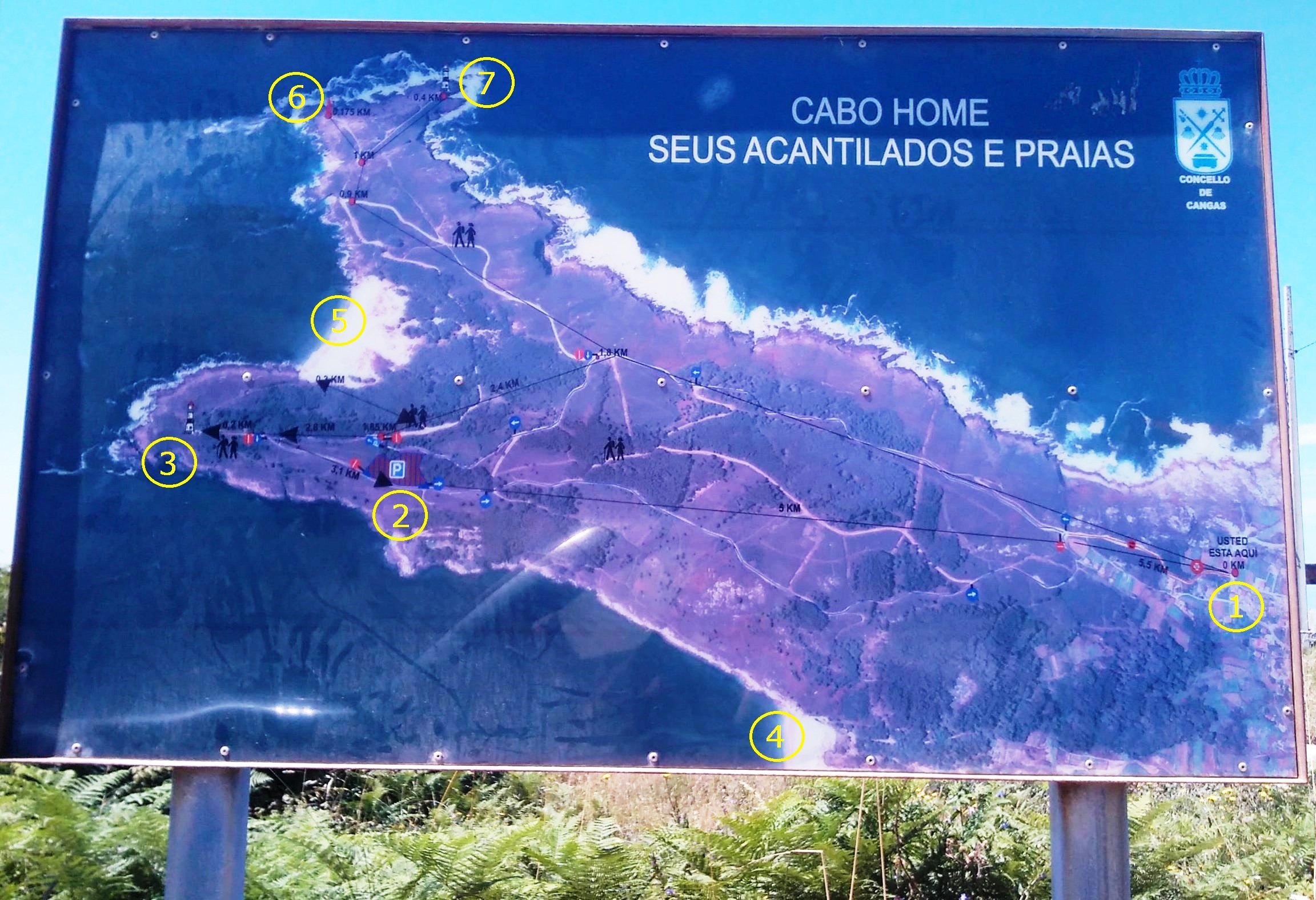 No tardaremos mucho más de media hora en volver al parking desde el Faro de Cabo Home. Primero tenemos que deshacer nuestros pasos hasta coger una pista no asfaltada que se dirige hacia la Praia de Melide pero tirando más hacia el interior, hasta encontrarnos de nuevo con la señal del parking y volver al punto de inicio.