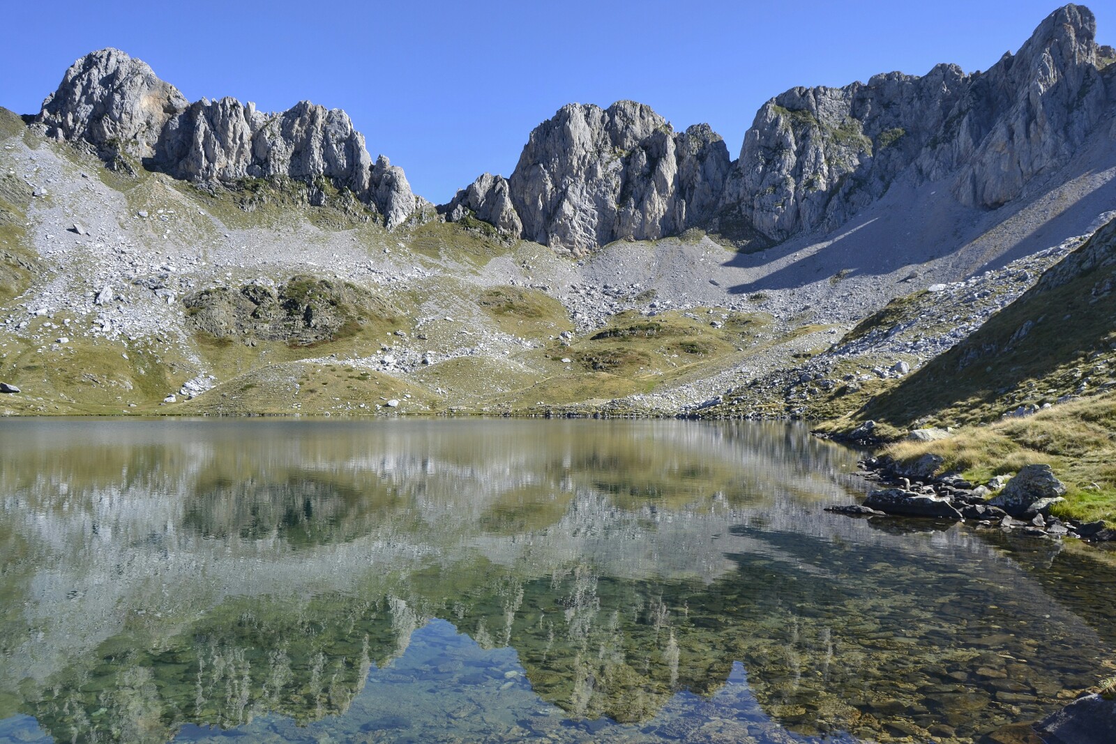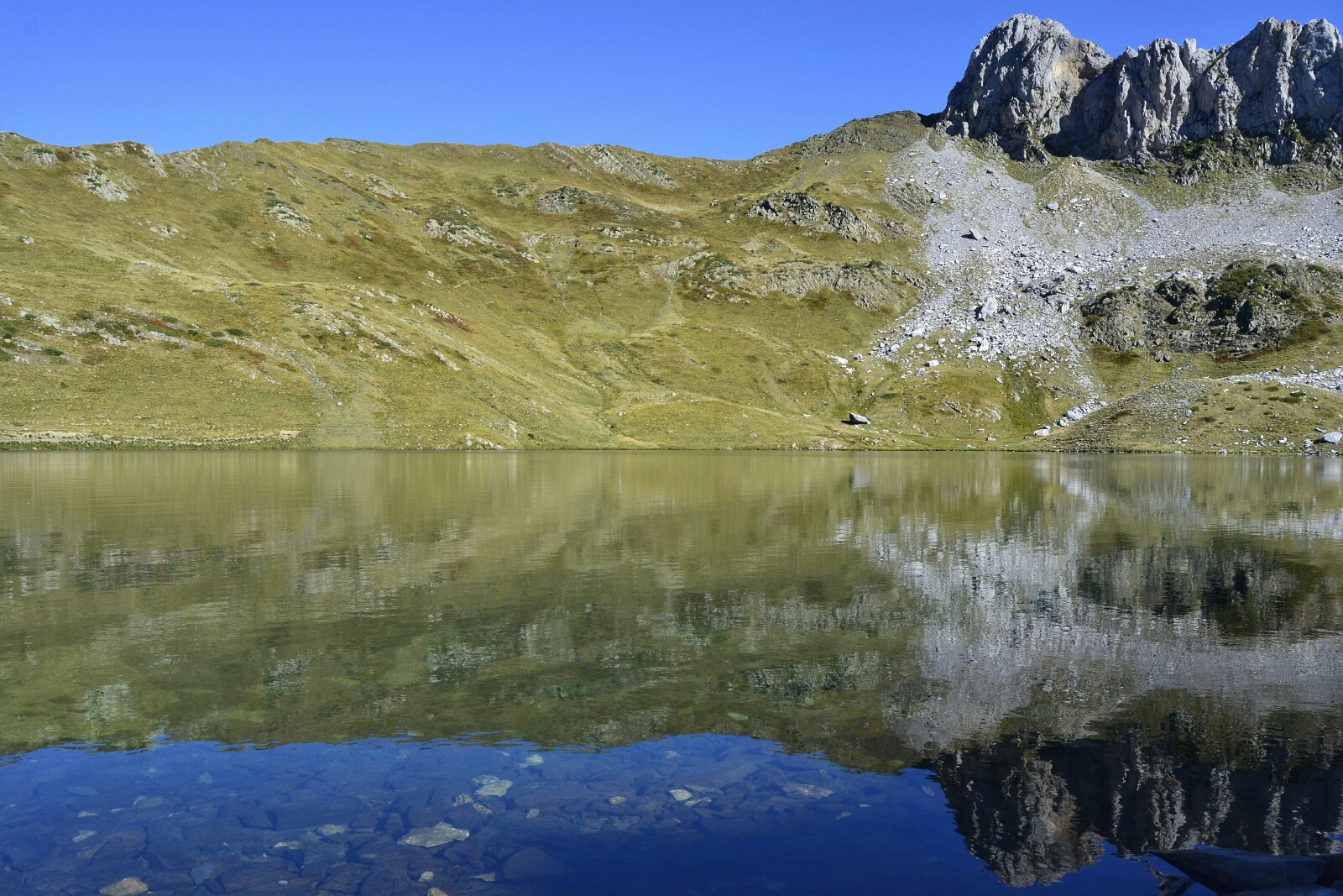 Ante la imposibilidad de darme un baño, busqué una ladera con sombra y vistas al ibón para sentarme a tomar mi bocadillo y contemplar la claridad del agua (es lo bueno de empezar las rutas temprano: si no son demasiado largas vas sin prisas y puedes permitirte momentos de relax así).