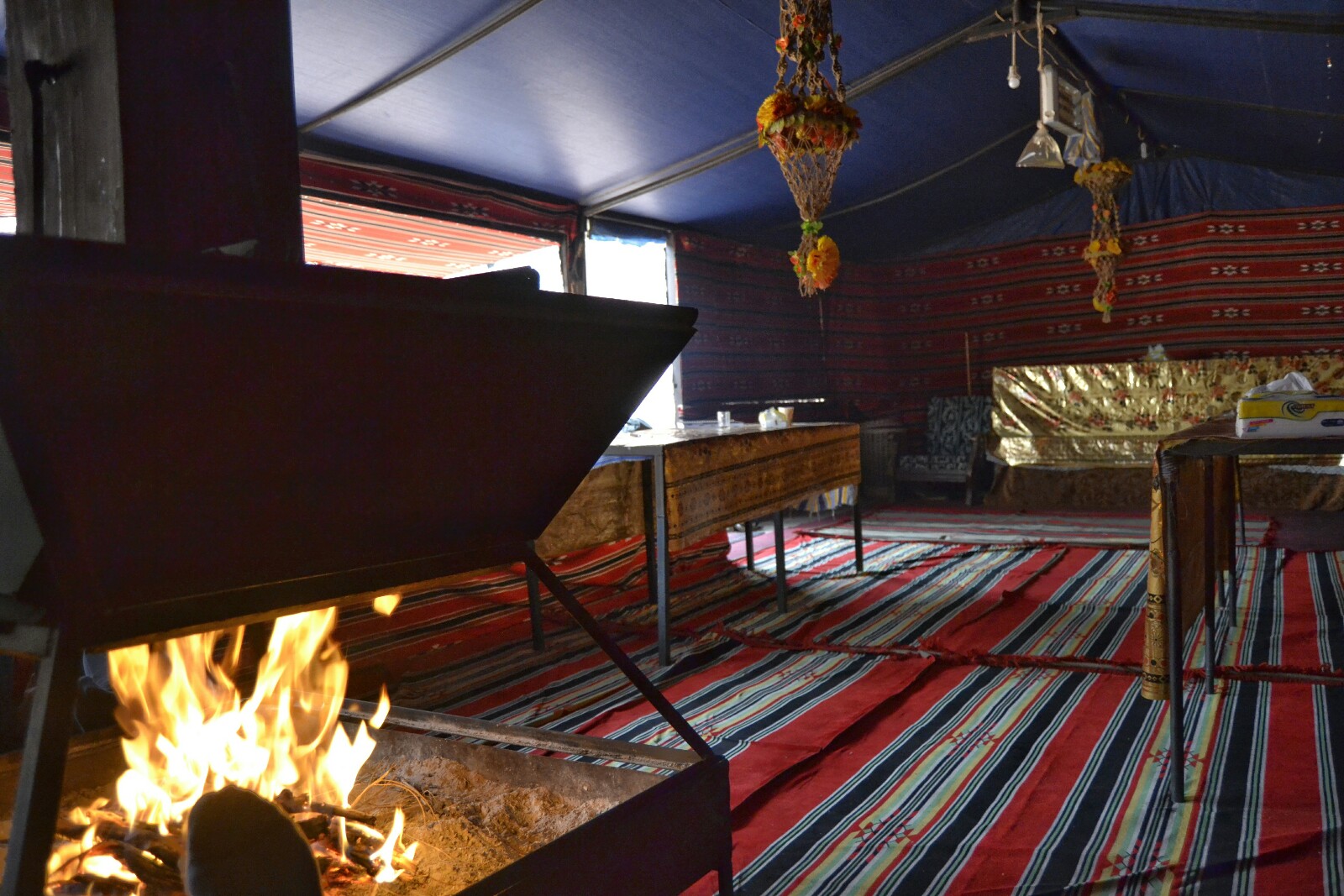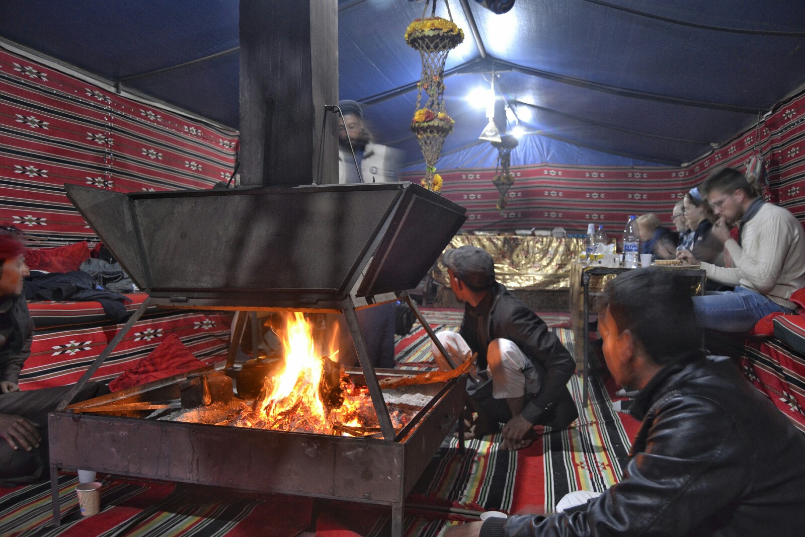 Volvimos al campamento cuando ya casi no quedaba nada de luz. Hacía bastante fresco (frío incluso), así que pasamos por nuestras tiendas para coger algo más de abrigo y nos fuimos directamente a la «jaima social» para conocer al resto de huéspedes y esperar la cena.
