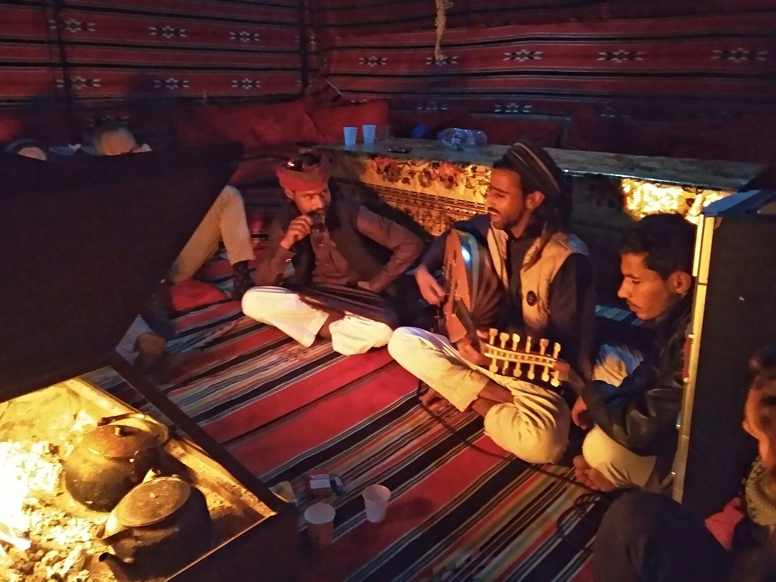 Después de cenar, uno de los múltiples primos-ayudantes de Nadjah sacó un laúd y amenizó la velada con canciones tradicionales mientras nos refugiábamos del frío exterior en la jaima y nos trasladábamos a un pasado remoto beduino.