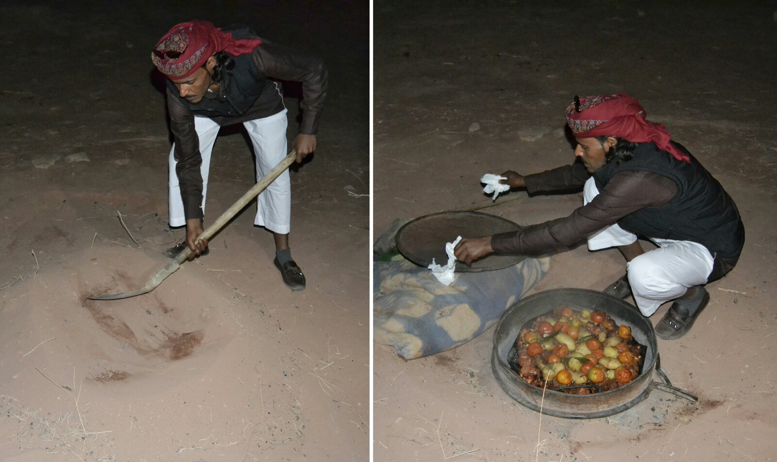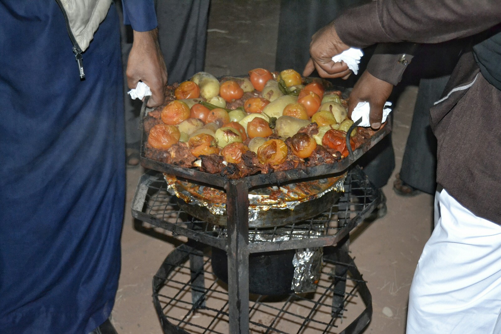 Sobre las 8 de la tarde vino Nadjah a avisarnos a todos para que saliésemos a ver cómo y dónde habían cocinado la cena: tienen una especie de cilindro metálico enterrado en la arena en el exterior de la jaima donde meten una estructura metálica con diferentes parrillas en las que colocan distintos tipos de carnes, patatas y vegetales para que se asen con las brasas del fondo del cilindro y el calor acumulado en el suelo del desierto.