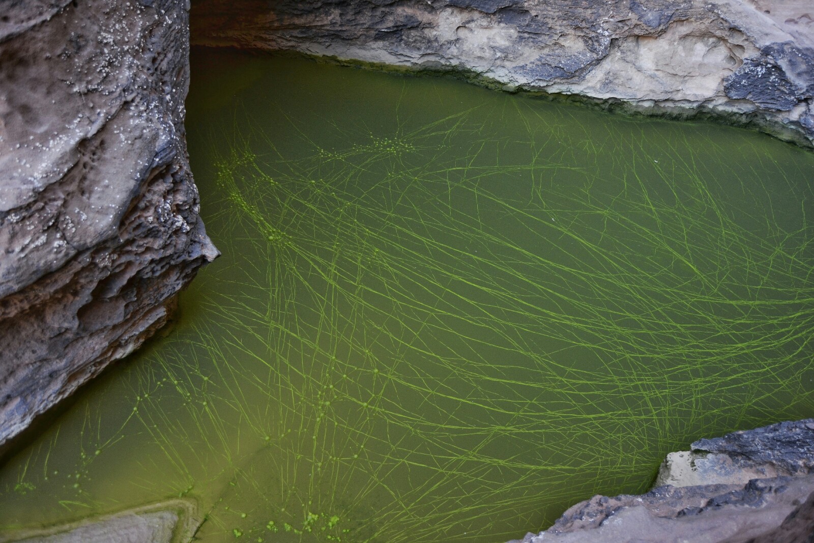 Hicimos la primera parada en el punto de unión de dos montañas. Aquí se acumula el agua de la lluvia (porque de vez en cuando llueve) formándose una especie de algas o vegetación acuática muy curiosa… y que a la vez da algo de yuyu.