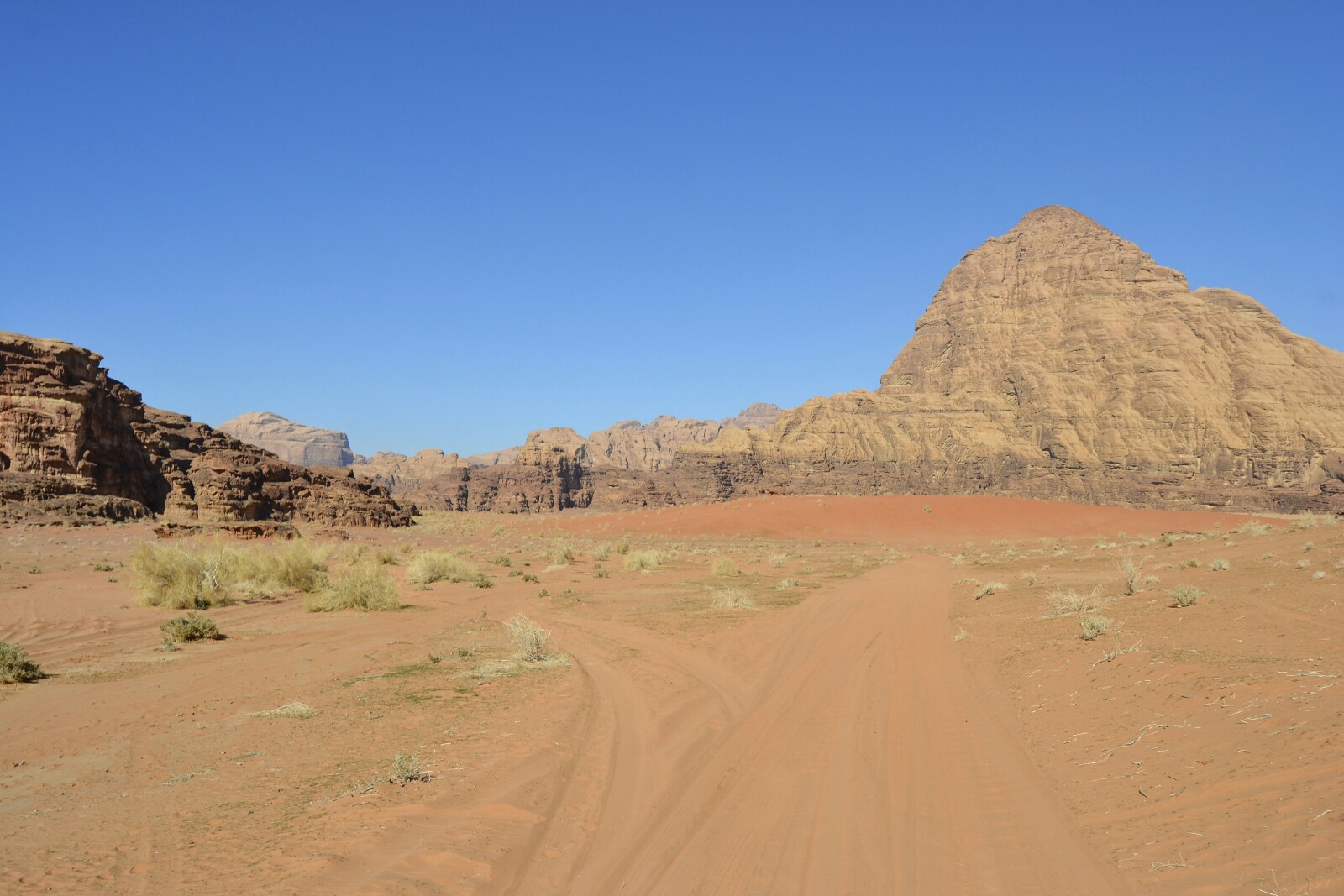 La carretera es buena y atraviesa preciosos paisajes (nada que ver con el horror paisajístico y «urbano» por el que habíamos conducido los días anteriores). Es muy sencillo seguir las indicaciones hasta que nos desviamos a una pista que lleva directamente al Centro de Visitantes del Wadi Rum, lugar en el que nos iban a recoger a las 16.00.