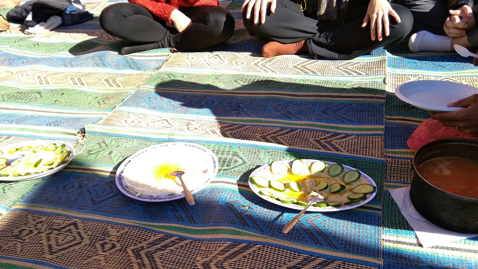 Tras descender por unas piedras, la fisura se abrió casi de golpe y empezamos a ver a lo lejos los coches y a nuestros guías beduinos preparando la comida: alubias con verduras, hummus con pepino y una salsa de berenjena con pan pita.