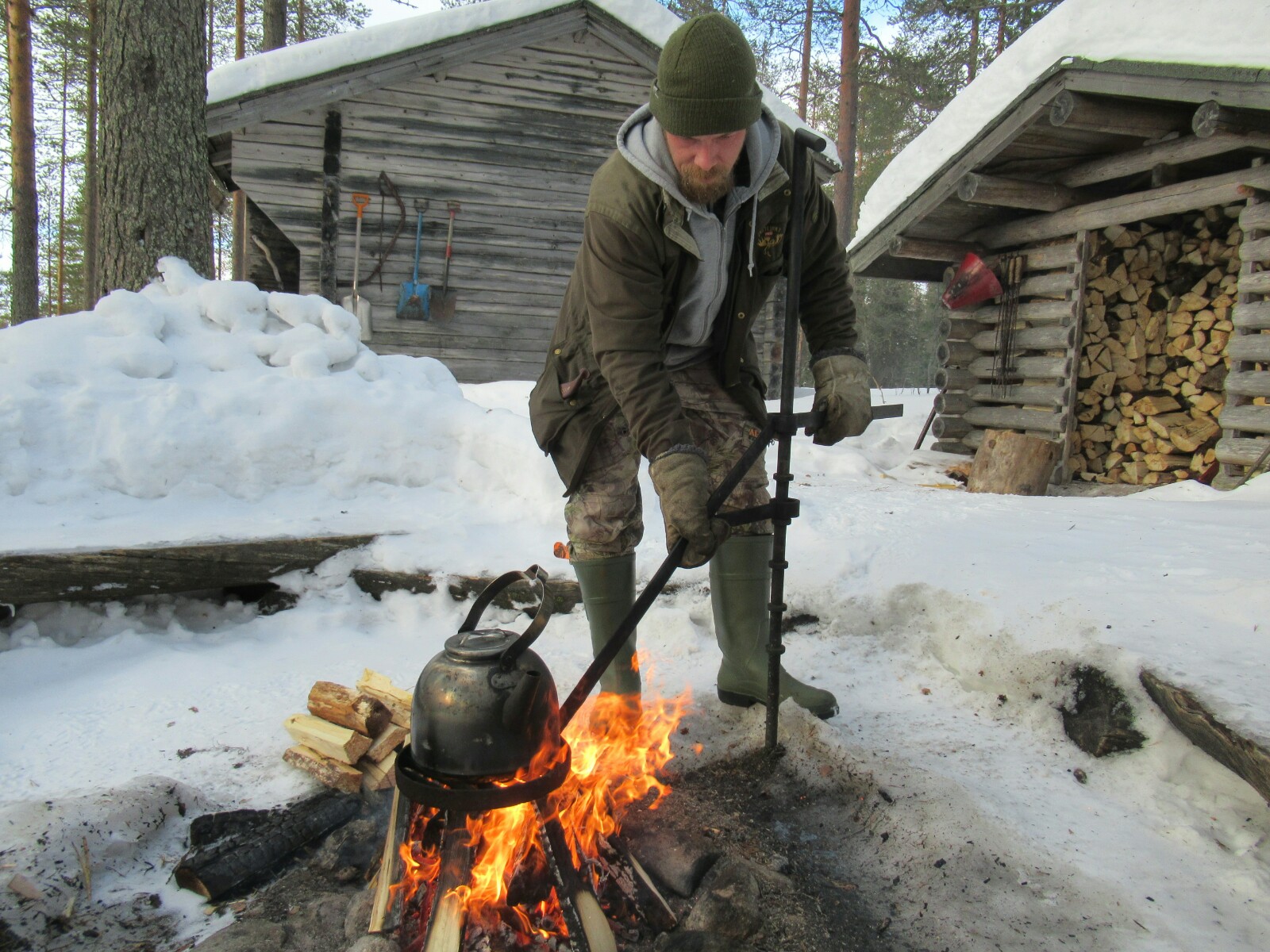 Allí el fuego al aire libre estaba ya a máximo rendimiento. ¡Antti nunca defrauda! Me senté un rato a relajar las piernas e hidratarme con un té con azúcar (o más bien, azúcar con té…) antes de entrar a cotillear la cabaña.
