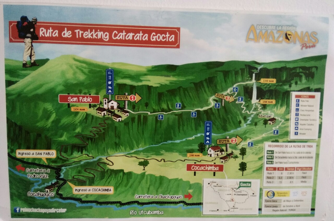 Ruta 1 o Ruta del Segundo Salto: es la más sencilla de las dos. Un camino de ida y vuelta que empieza y termina en Cocachimba (1800 msnm) y llega hasta la base de la segunda caída. Son algo más de 11 kilómetros en total con un desnivel acumulado nada tonto (aunque se puede alquilar una mula por 40 soles que hace unos dos tercios del recorrido).