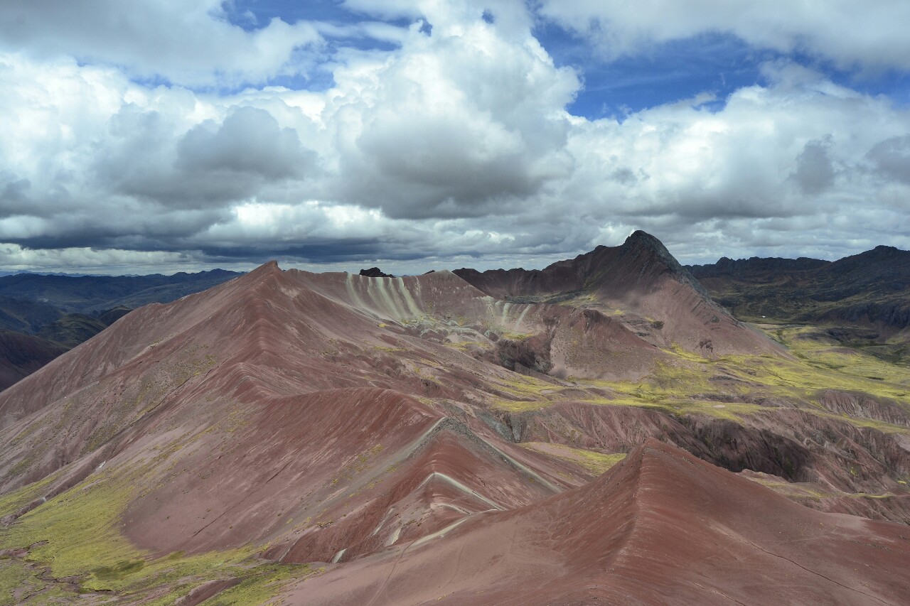 Y no solo las montañas que son rojas, sino la combinación completa junto con los tonos verdes, amarillentos, las nubes blancas y el cielo azul.