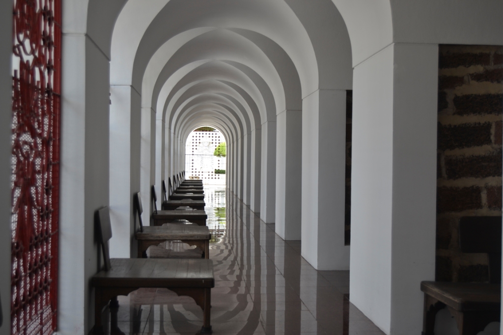 Bajo el techo, hay una serie de pasillos muy simétricos con pequeños habitáculos para la meditación en cada punto de intersección.
