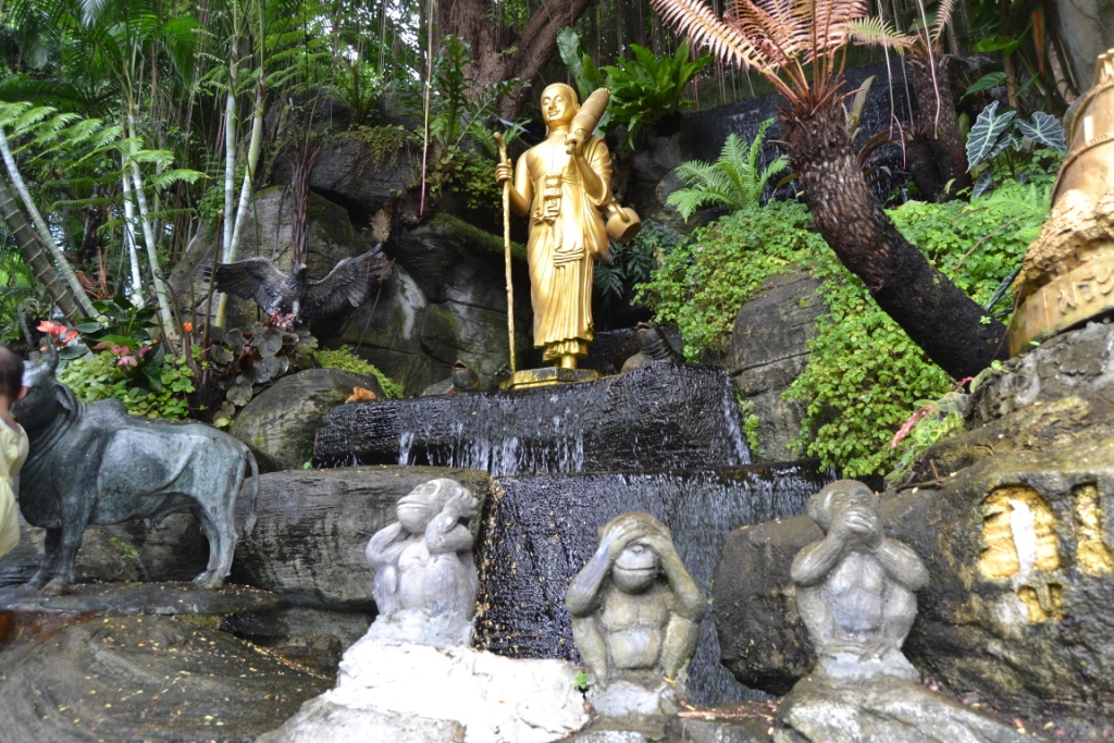 En la actualidad, parece más un sitio de feria que de veneración, pero la visita me resultó curiosa. En la base de la colina hay algunas figuras decorativas algo horteras junto a las escaleras… (incluyendo los tres monos del whatsapp)…