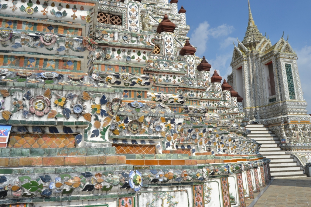 Pero sin duda la parte que más me gustó fue la sección oeste del patio. Aquí sobresalen, sobre las otras 99 de Wath Pho, las cuatro enormes Chedis decoradas con baldosas.