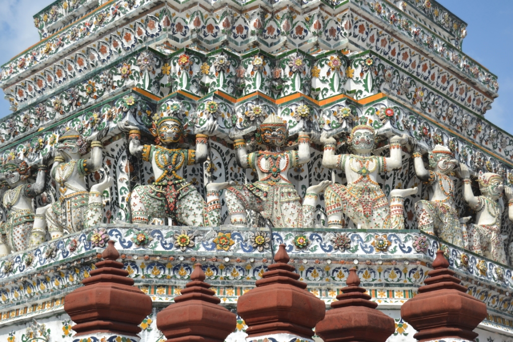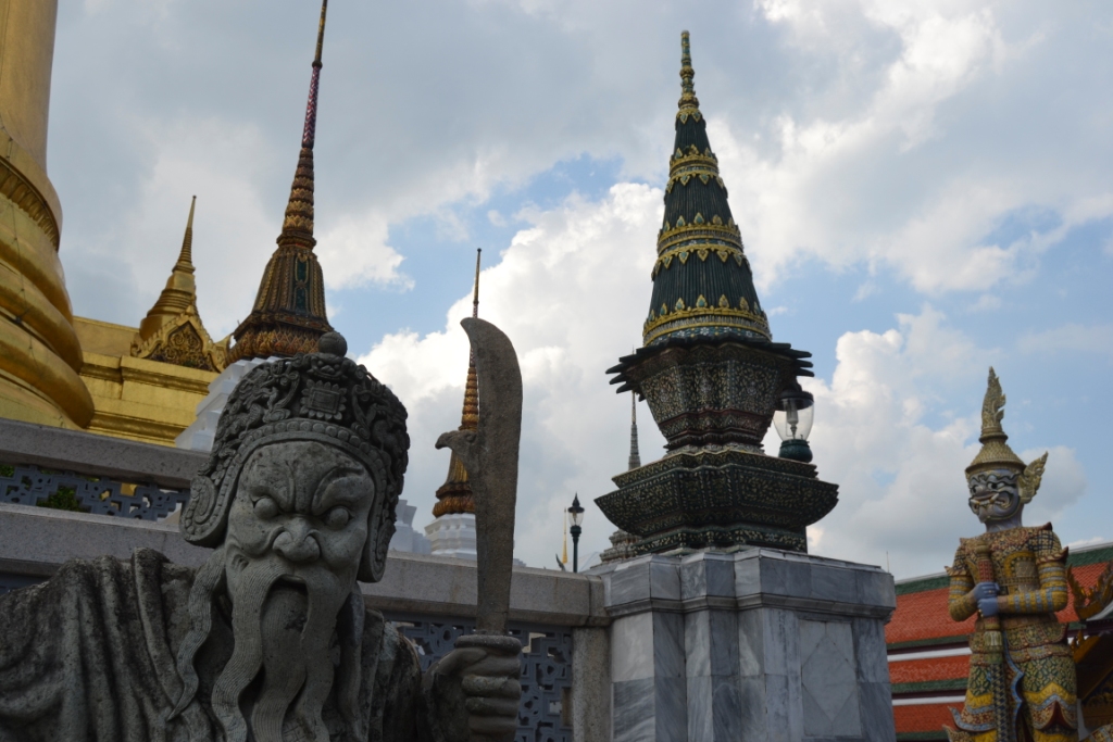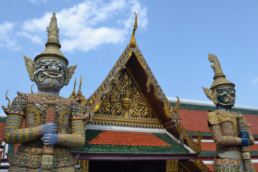 Lo primero que llama la atención son las parejas de figuras de yakshas de 6 metros de altos (demonios del Ramayana que protegen el sagrado y venerado Buda Esmeralda y espantan a los malos espíritus).