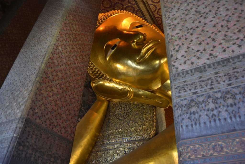 Además de estas cuatro enormes Chedis, lo que sobresale de esta parte de Wat Pho es la capilla del enorme Buda Reclinado de 45 metros de largo que muestra a Buda entrando en el Nirvana.