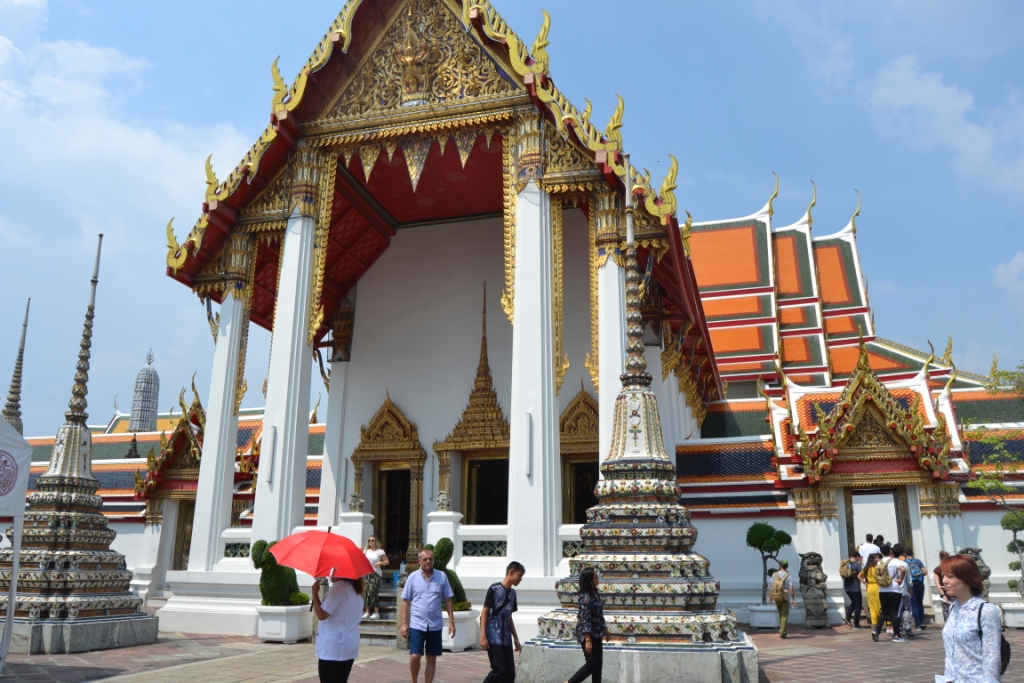 Muy cerca del Gran Palacio (siguiendo el interminable muro hacia el sur) está esta joya de la ciudad, mucho menos visitada que Wat Phra Kaew pero igualmente maravillosa.