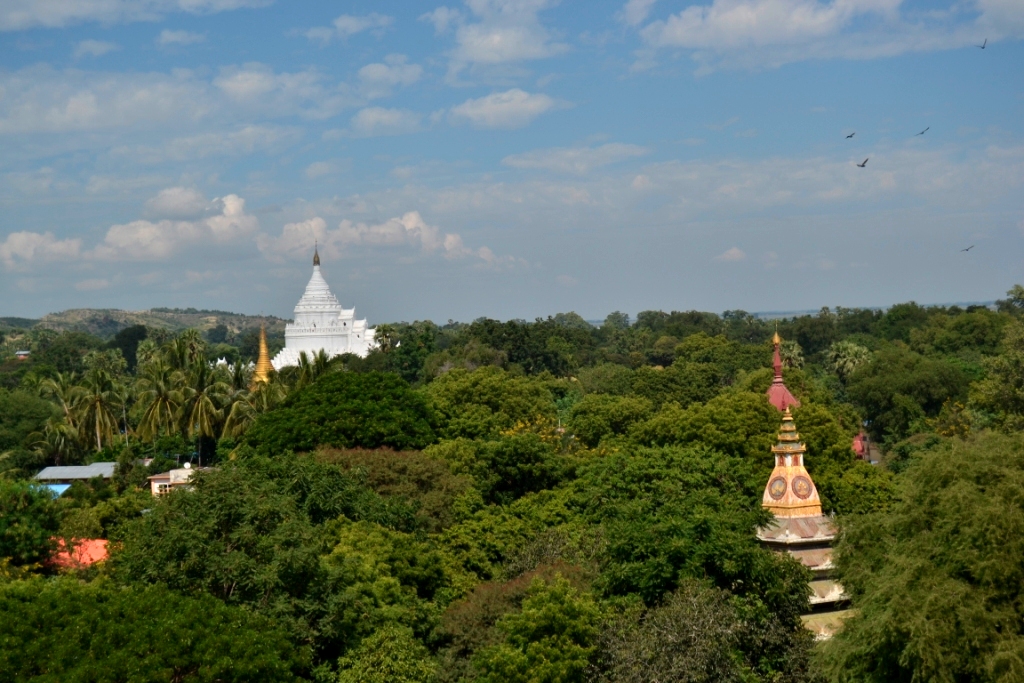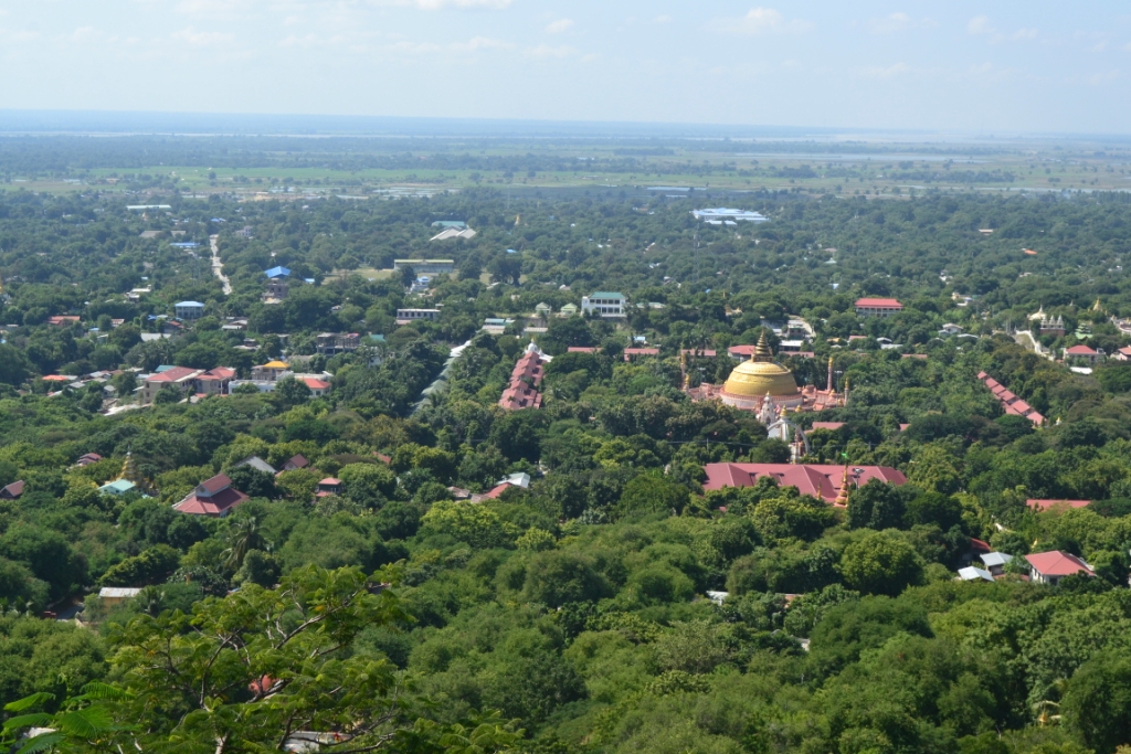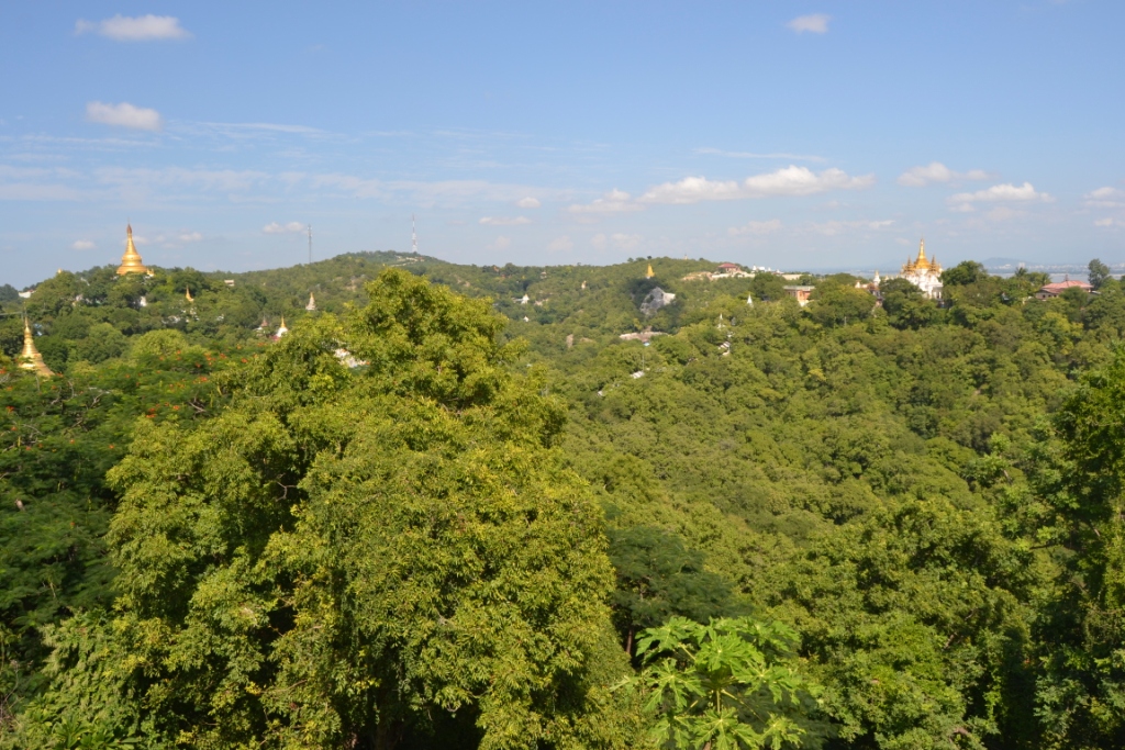 Mirando hacia Mandalay, hay una preciosa vista del río y de varias colinas frondosísimas con árboles y un montón de pequeñas pagodas sobresaliendo entre la vegetación.