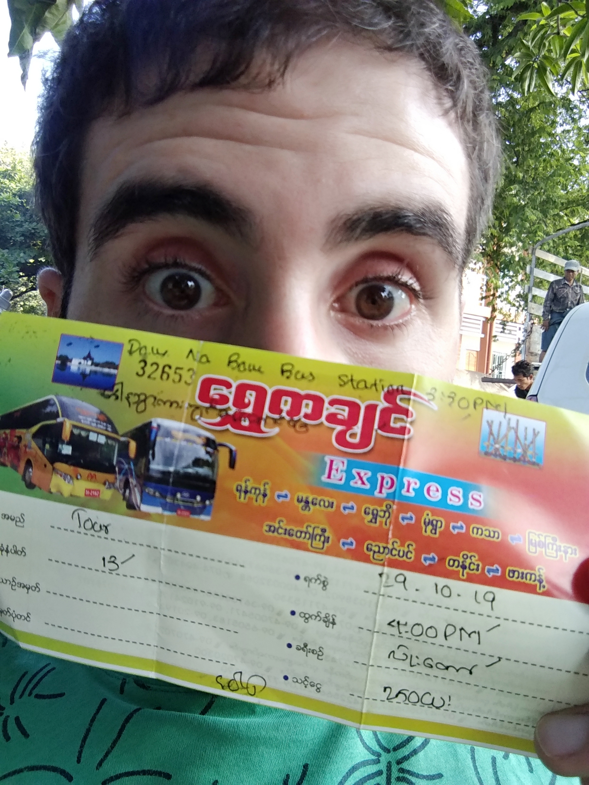 El billete cuesta 25.000 Kyats pero el autobús suele ir medio vacío y es relativamente cómodo, así que es fácil encontrar una postura más o menos confortable para aprovechar la noche (a mí se me pasó bastante más rápido de lo que esperaba).