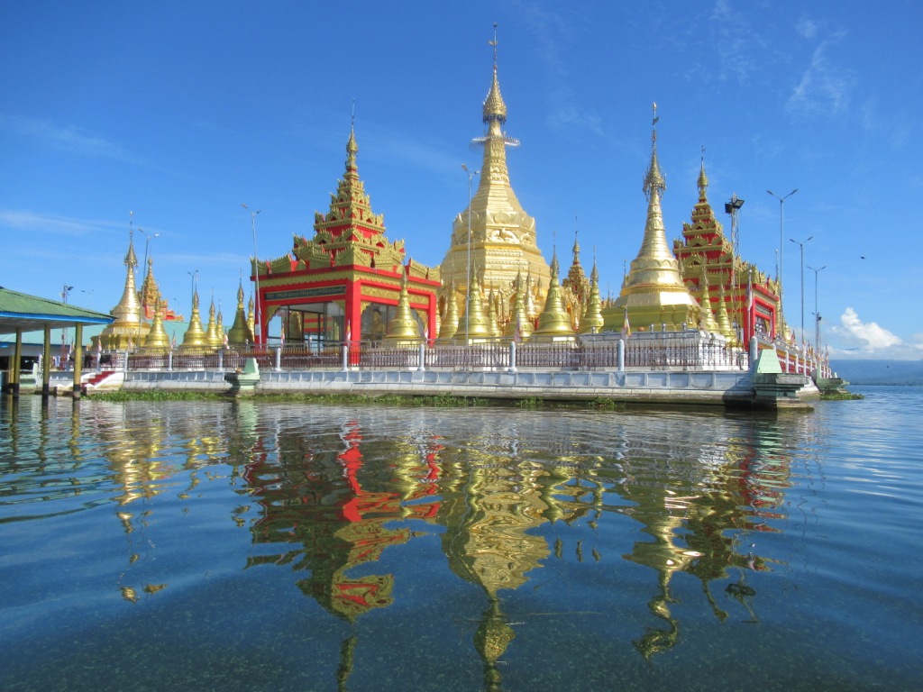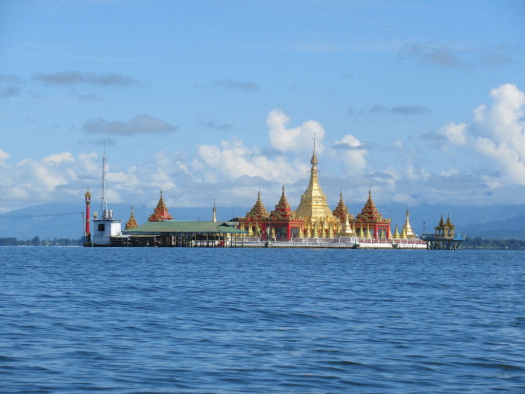 Una de las características más curiosas del lago es la existencia de esta pagoda dorada (doradísima, de hecho) en una pequeña islita a la que, en general, solo se puede acceder en una embarcación (salvo en la época seca ya que el nivel del agua baja y se puede acceder por un camino).