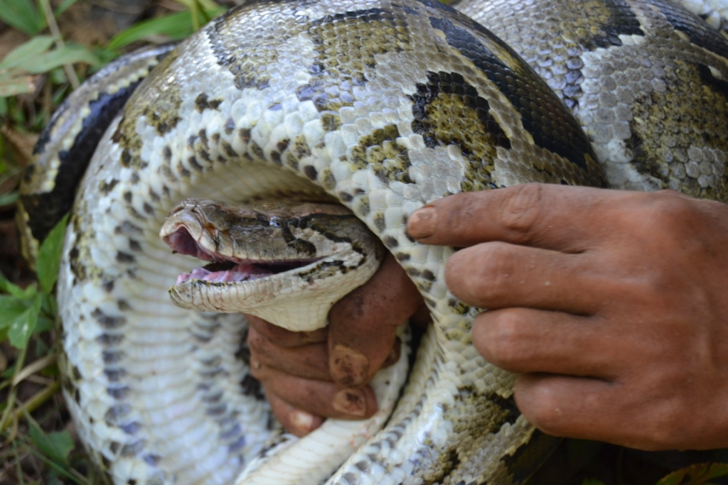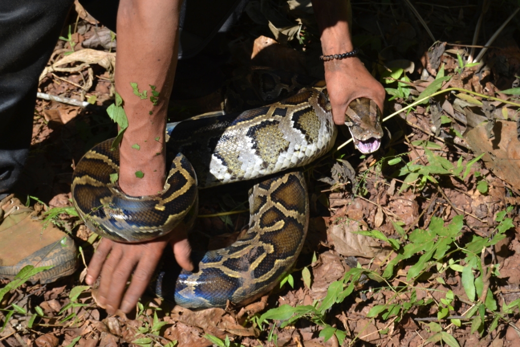 Tras comprobar que, efectivamente, era la especie local, le eché un cable para desenrollarla porque la pitón estaba haciendo una fuerza considerable y, ya libre, se fue de nuevo a la jungla echando pestes de esos dos humanos que habían venido a darle la tabarra.