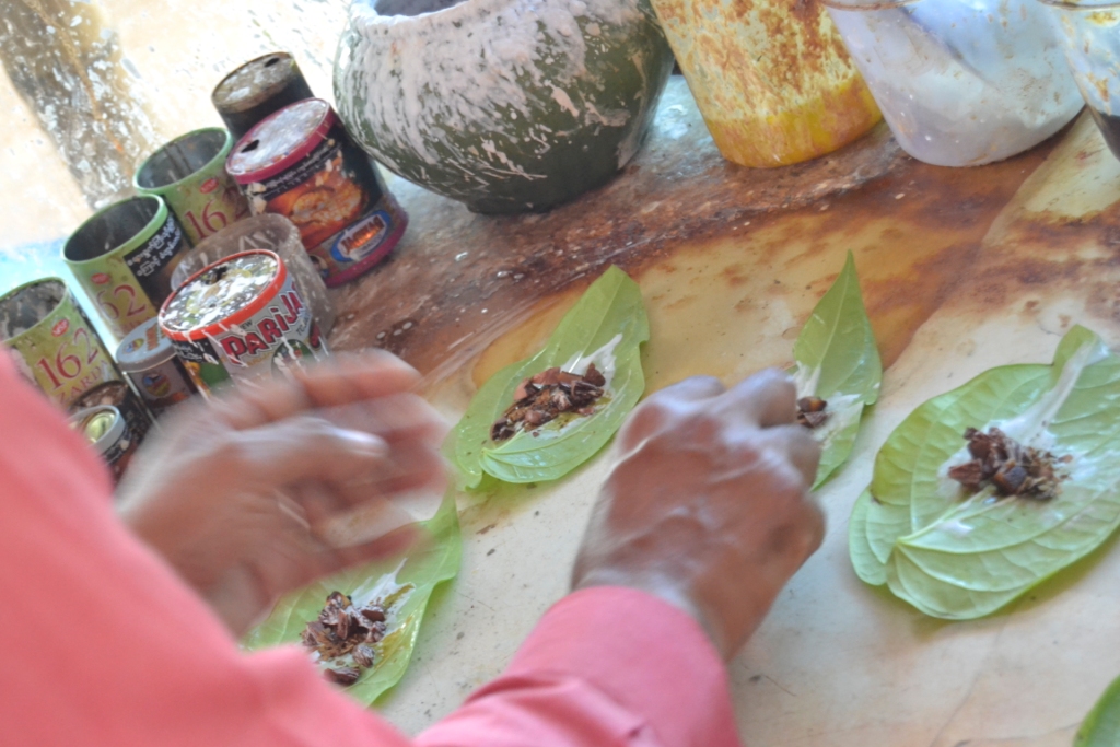 Se trata de una mezcla hecha con nueces de areca, tabaco y demás ingredientes (que pueden pasar por coco, papaya o lo que se les ocurra), todo enrollado en una hoja y masticando en la parte final de la boca hasta que suelta todo el jugo que acaban escupiendo.