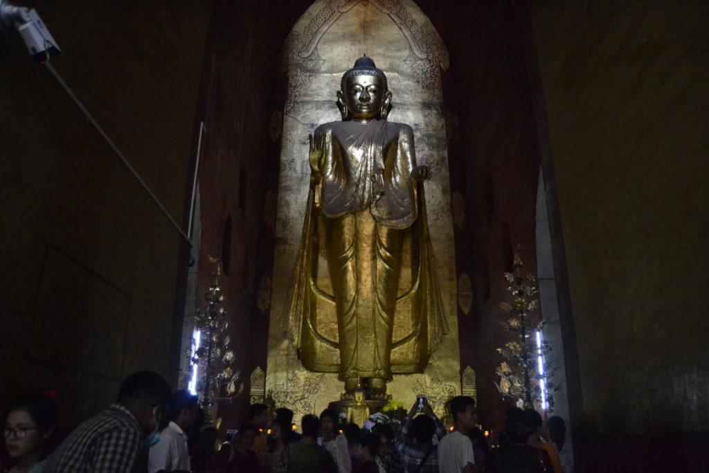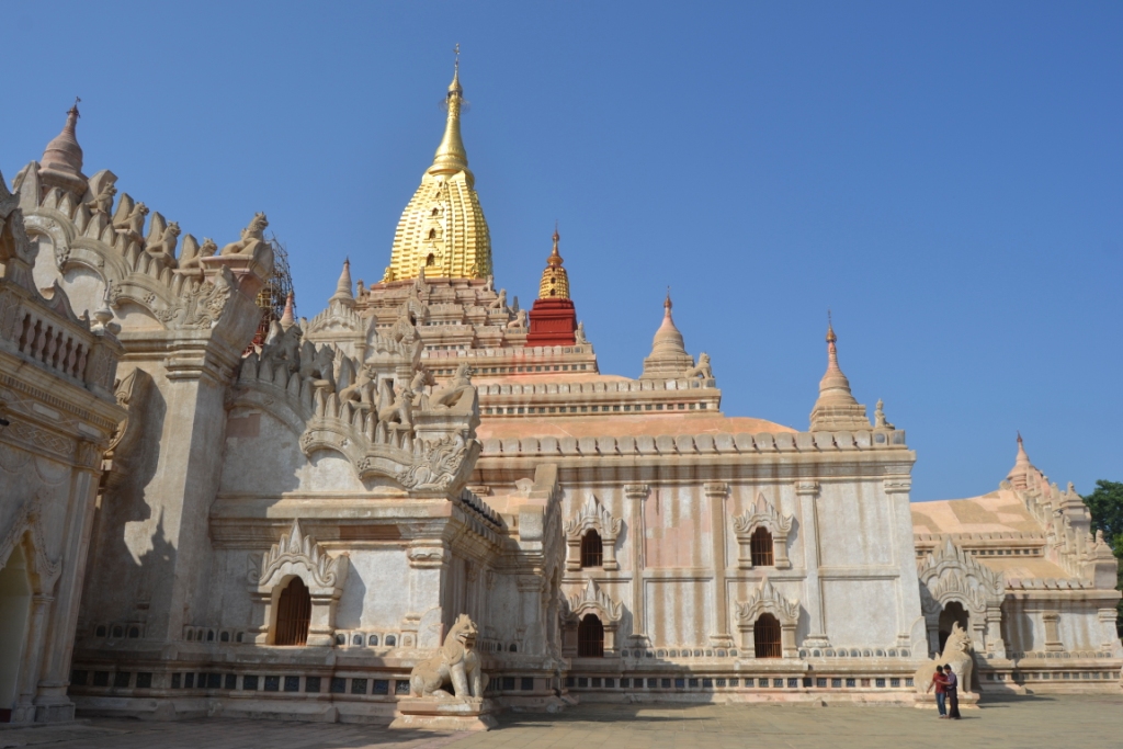 Pero, sin lugar a dudas, el templo que más nos impresionó de lo que llevábamos de día fue Ananda Paya, casi ya a la entrada de Old Bagan, y que llama la atención por sus formas y colorido. Se construyó aproximadamente en 1100 y, desde el principio, fue de los templos más grandes de Bagan.