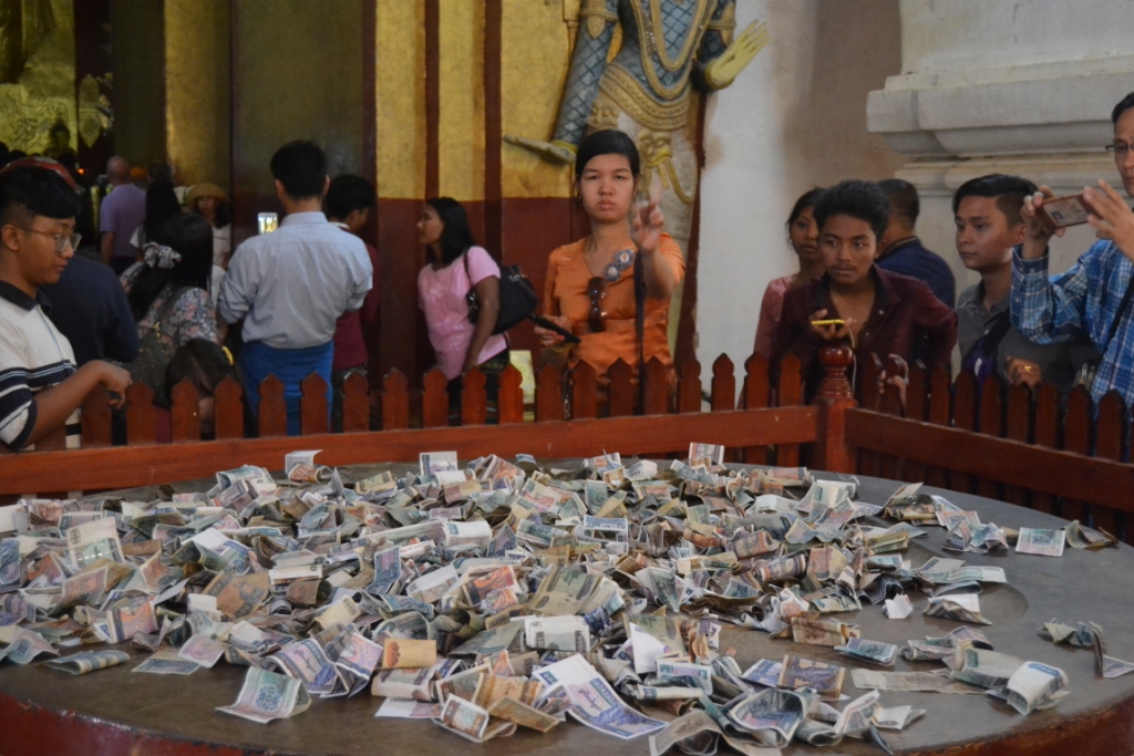 Una vez dentro, nos hizo gracia una especie de plataforma redonda a la que la gente tiraba dinero. Era gracioso, porque como en Myanmar no hay monedas, todos intentaban que su billete cayese justo encima de la plataforma y no por uno de los laterales (a lo mejor se supone que trae más suerte).