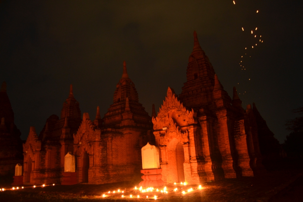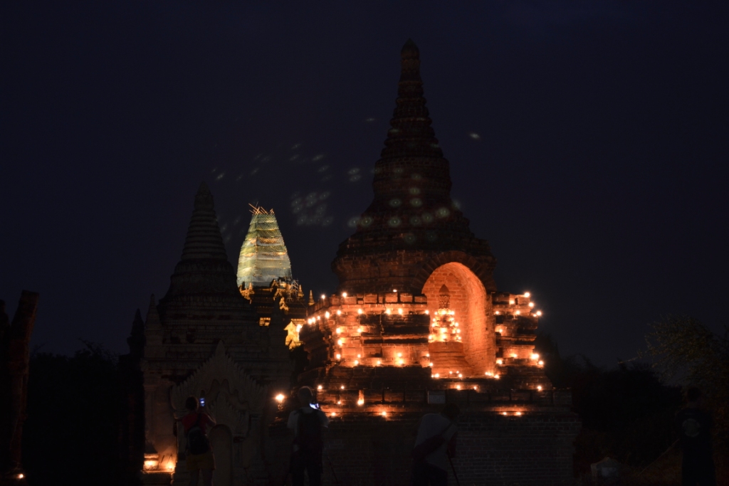 Volviendo hacia el hostal nos detuvimos en una zona en la que había un montón de gente preparando algo (cerca de los templos Khayminga y Upali Thein). Estaban colocando velas para, seguramente hacer algo por la noche.